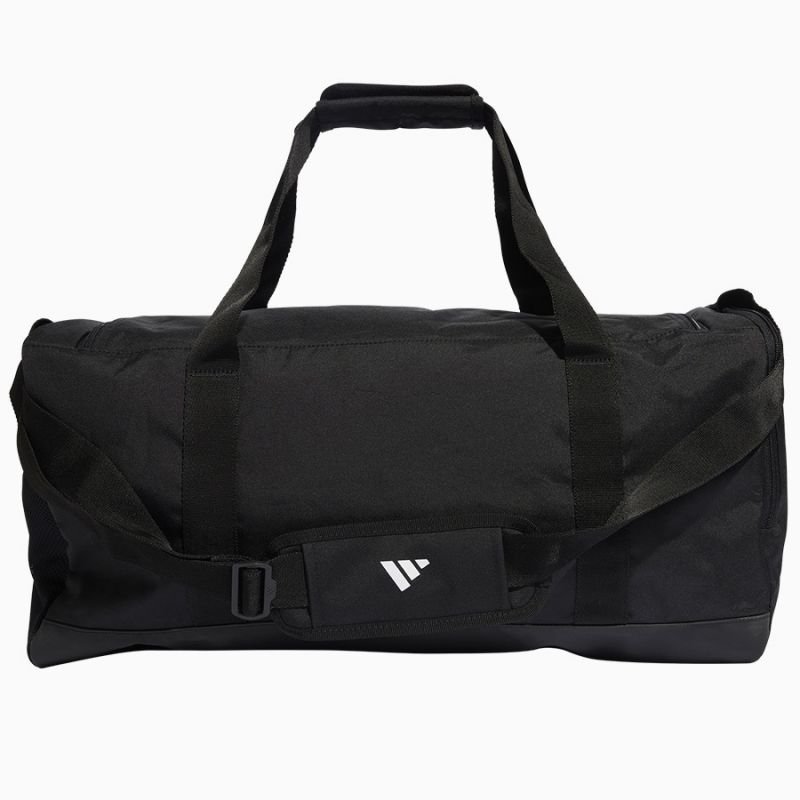 Properties: Adidas sports bag. Made of high-quality materials. Main compartment fastened with a zipper. Additional external pockets. Bottom reinforced with waterproof material. Adjustable shoulder strap and handles. Material: synthetic Color: black