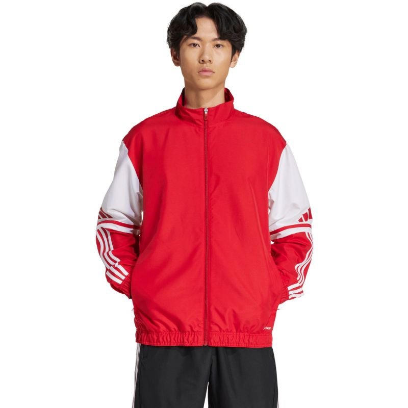 adidas Squadra 25 Presentation men’s sweatshirt red JD2969 Properties: This adidas men’s sweatshirt is perfect for training and relaxing off the pitch. Quick-drying fabric with Aeroready technology wicks away excess moisture. One-way zipper. Standing collar. Zippered side pockets. Ribbed cuffs and hem. Small logo and stripes running along part of the sleeves. This product is made from high-quality recycled materials. Material: 100% recycled polyester