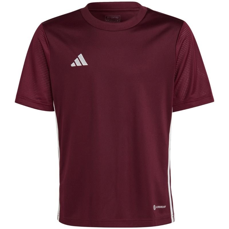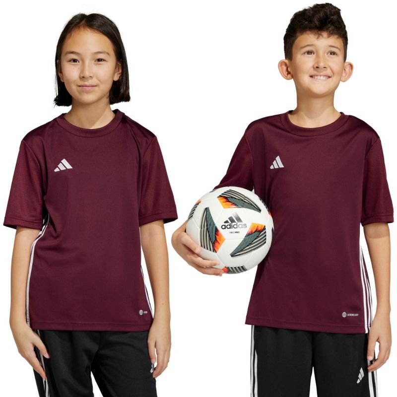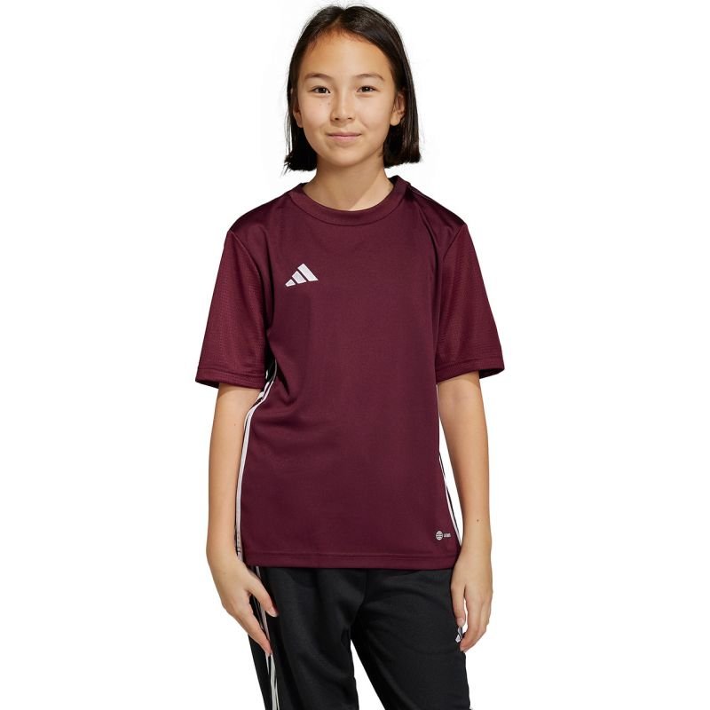 adidas Table 23 Jersey Burgundy IB4933 Properties: The adidas kids’ T-shirt is a match-ready model that will help ensure long-lasting comfort. Regular fit with a rounded neckline. The T-shirt is made of quick-drying fibers supported by Aeroready technology that absorbs moisture. Mesh sleeves. Polyester fibers are created through a recycling process. Embroidered brand logo on the chest. Stripes on the sides. Material: 100% recycled polyester