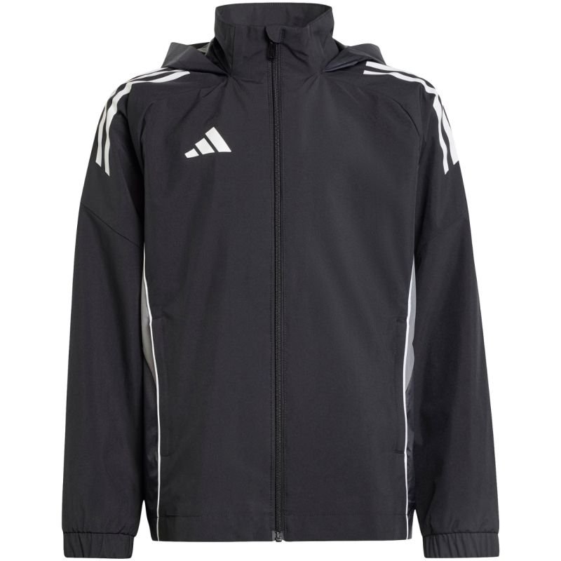 adidas Tiro 25 Competition All Weather Jacket for Kids, Black IW0448 This adidas Tiro jacket for kids is perfect for training. A full-length zipper allows for quick dressing. A chin guard protects the chin. The hood is adjustable with toggles and can be tucked into the collar. Specifications: Outer fabric: 100% recycled polyester Inner fabric: 100% thermoplastic polyurethane Standard fit Front zip pockets Mesh lining Concealed hood Elastic cuffs