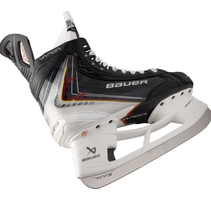 Bauer FX Vapor Flypro Sr Hockey Skates Properties: Bauer FX Vapor Flypro Sr Hockey Skates Discover a new dimension of speed Bauer VAPOR FLYPRO Sr ice skates are for players who want to get the most out of every step. Thanks to the latest technological solutions, they provide even greater dynamics, responsiveness, and comfort. Lightweight, flexible, and designed for professional play, they will help you gain an advantage where every fraction of a second counts. Key Features Dominate every turn: 3D-lasted CURV® composite shell provides professional-level thermoformability and support that allows you to achieve maximum power in acceleration, stopping and changing direction. Energy in every stride: Three precisely placed HYPERFLEX grooves in the forefoot allow for a deeper stride and improved knee angle. This works like a spring, returning energy with every toe-off, allowing you to accelerate faster than ever before. Pro-level comfort: A 48-gram pro-stock felt tongue, Aerofoam+ foam at the ankles, and Hydrolite padding ensure a snug fit and dry comfort throughout the match. Focus on the game, not your equipment. The Bauer VAPOR FLYPRO Sr. skates are designed for the most demanding players – fast, technical, and aware of every move. If you want to gain an advantage, utilize technology that actually works. TECHNICAL SPECIFICATIONS: Intended Use: Hockey, Field Player, Senior; FLY-X Blades: 3D-lasted CURV® composite; Pro-stock Tongue: 48-oz. felt; EDGE Blade Replacement: Yes; Thermoformable: Yes; Hydrolite Liner: Bauer Performance Fit System: A player can choose skates based on their skating style, not just their foot type. Previously, if a player wanted the Supreme but the scanner showed Vapor, they were told to choose Vapor for optimal fit. Today, you can choose both the skates that fit optimally and the ones that best suit your playing style. By analyzing thousands of foot scans, Bauer was able to create a skate designed for both performance and fit. New Additional Fit Options for the Vapor Hyperlite2 Sr. Bauer’s revolutionary Performance Fit System gives players the ability to get almost anything: the skate they want, the performance they desire, and even the fit they need. FIT 1 is for low ankles and narrow feet. FIT 2 is for high ankles and normal feet (the most common choice). FIT 3 is for high ankles and wide feet.