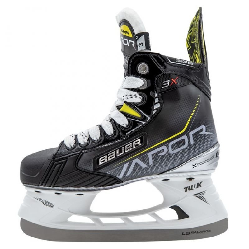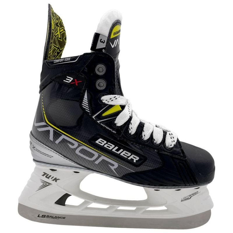Bauer Vapor 3X Jr. Ice Skates: Junior Design and Development: The Digi Comp quarter-blade, with its softer construction and MotionFlex technology, increases the flexibility of the boot. For younger players developing their stride, this ease of flexing helps build good technique. LS Balance Blade: The combination of increased steel height and a 13-foot profile helps develop balance in all skating movements. A Better Fit for the Young Player: The asymmetrical toe cap, based on analysis of over 1,000,000 player foot scans, creates a better connection between the player’s foot and the boot by minimizing negative space around the toes. The tongue padding provides a better connection between the player’s foot and the boot. TECHNICAL SPECIFICATIONS: Intended Use: Hockey, field player, junior. LS Balance Blades: Material: Composite, Digi Comp+. Tongue: Felt with liner. Blades replaceable with the EDGE system. Yes. Thermoformable. Yes. Lining: Microfiber, Aerofoam.