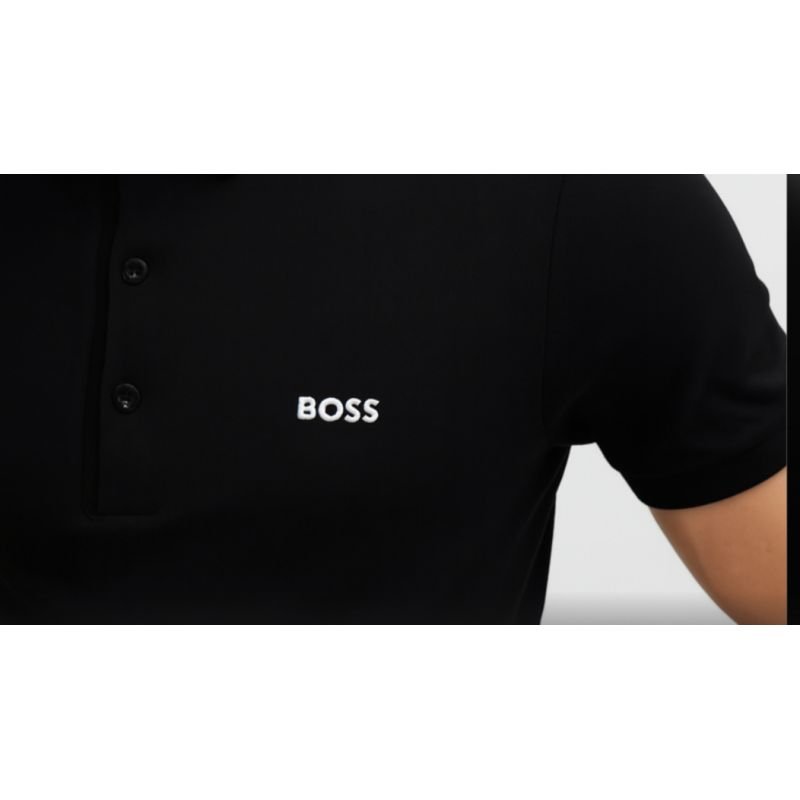 Properties: Color: Black Cut: Slim Fit – fitted cut that highlights the silhouette Material: 92% polyester (recycled), 8% elastane Technology: Quick-drying material with moisture-wicking function Collar: Classic polo collar with 3-button placket Logo: Contrast BOSS logo on left chest Sleeves: Short, ribbed