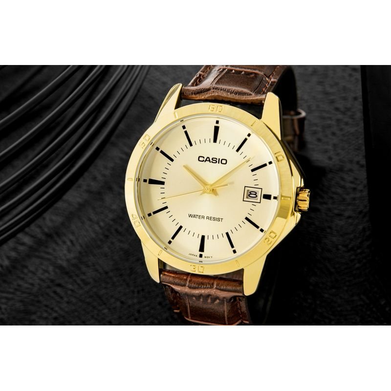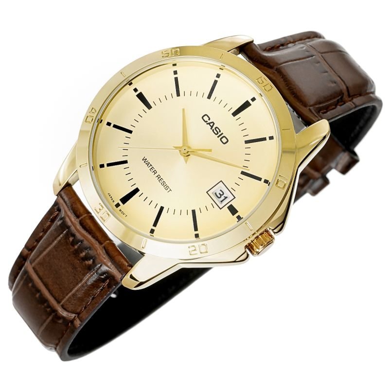 Casio MTP-V004GL-9A Men’s Watch + BOX Elegant simplicity that perfectly complements any style. The classic CASIO MTP-V004 analog watches, featuring a timeless hour, minute, and seconds hands, combine functionality with elegance, perfect for both everyday and formal occasions. Bold indices and a practical day display at 3 o’clock perfectly combine aesthetics with comfort. Water resistance ensures protection during everyday activities, so you don’t have to worry about rain or contact with water. This watch combines style, precision, and everyday reliability. Product description: BRAND: CASIO MODEL: MTP-V004GL-9A MOVEMENT: Precise quartz with three hands: hour, minute and second DIAL: Analog with date and day function CASE: Round, made of high-quality stainless steel GLASS: Mineral, scratch-resistant STRAP: Natural leather FLUORESCENCE: None WATER RESISTANCE: Water Resist (WR) – splash-proof ANTI-ALLERGIC: Yes – nickel-free, safe for the skin Dimensions in mm: Case: 40 mm Dial: 33 mm Thickness: 10 mm Strap: width: 20 mm Circumference: 170 mm – 220 mm Color: Case: gold Dial: gold reflecting light Indexes: black Hands: gold / Second hand: gold Watch strap: brown/crocodile texture QUARTZ MOVEMENT – accuracy and reliability High timekeeping accuracy thanks to the use of a quartz crystal allows you to effortlessly plan your day. Furthermore, intuitive operation means you don’t have to worry about complicated winding or time setting, increasing convenience. Replacing the battery is the only regular maintenance required when using a quartz watch. It’s the perfect choice for busy men who value comfort and simplicity. MINERAL GLASS – OPTIMAL PROTECTION AND EASY TO READ DIAL The crystal used in this watch is made of silicate mineral glass, which is harder than synthetic glass. This effectively protects the dial from scratches, damage, and dirt. Furthermore, mineral glass is flexible, making it less susceptible to cracks and shattering. It also provides excellent clarity and brightness, significantly facilitating quick and clear reading of the time in various lighting conditions. WATER RESISTANCE WR (Water Resistant) It offers the protection and reliability you need for everyday use. The watch is water-resistant enough to withstand many common everyday situations, such as sudden rainfall or contact with water while washing your hands. ADDITIONAL FUNCTIONALITY – DATE STAMP The date display on this model is located at 3 o’clock and features a classic window format that displays the current day of the month. The white background with black numerals ensures excellent readability, and its location on the dial makes it easily visible without detracting from the watch’s clean design. PERFECTLY FITTING LEATHER BELT WITH CLASSIC BUCKLE Soft, supple leather develops its own character over time, developing a unique patina that emphasizes masculine style and timeless elegance. The classic buckle ensures perfect hold, while the silver logo buckle adds a prestigious finish. This is the choice for those who know that classics never go out of style and true quality stands the test of time. THE SET INCLUDES: Original CASIO watch CASIO branded box Warranty card with user manual CASIO WATCH – TIME AT ITS BEST Thanks to exceptional attention to detail and rigorous durability testing, Casio offers timepieces that have earned the title “watches for generations.” It’s a brand trusted by millions of people around the world, from globetrotters and athletes to those seeking everyday elegance. Casio isn’t just a watch—it’s durability, innovation, and history etched into every second.