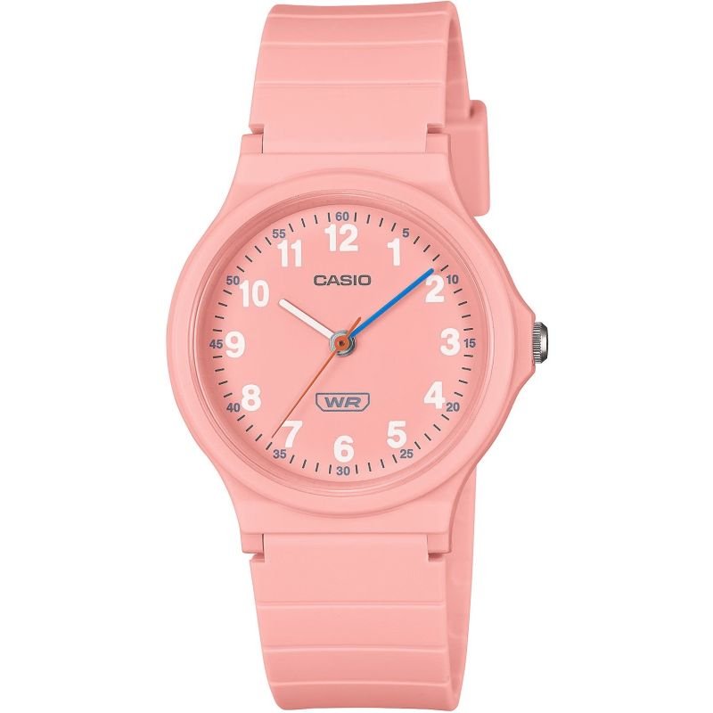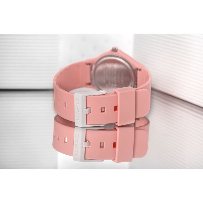 Casio LQ-24B-4BDF Children’s Watch + BOX The Casio LQ-24B-1BDF is a watch that combines simple design with reliability, created with younger users and their needs in mind. Its classic, single-color dial with clear, white numerals allows for quick and easy reading of the time, making it an ideal accessory for children and young adults. The thin and compact case design fits perfectly on smaller wrists, emphasizing the universal appeal of this model. Product description: Brand : Casio Symbol : LQ-24B-4BDF Model : LQ-24B Mechanism : Quartz Dial: Analog Case : Plastic Glass : Mineral Strap : Bio-based Resin Backlight : None Water resistance : Water Resist (WR) Anti-allergic : Yes – nickel-free Dimensions in mm: Case : diameter: 30 Dial : diameter: 27 Thickness : 8 Strap width : 16.5 Circumference : max 210 Color: Envelope : powder pink Dial : powder pink Numbers: white Hands : white/blue Second hand : orange Belt : powder pink DESIGN FOR THE YOUNGEST The clear design with large numerals on the dial and subtle color accents make reading the time simple and enjoyable. The lightweight construction and comfortable strap made of eco-friendly bio-based resin material ensure all-day comfort, perfectly fitting smaller wrists. This is the perfect model for children – practical, durable, and designed to complement their style and active lifestyle. SMALL SIZE – BIG EFFECT The watch is designed with small hands in mind – its 30mm case is the perfect size, perfectly fitting a child’s wrist while ensuring comfort. The 27mm dial is well-proportioned, making it easy for children to read the time without being overpowered by excessive detail. The watch’s thickness of just 8mm makes it lightweight and comfortable, especially important for small hands learning to wear a watch. The strap length can be adjusted up to 185mm, allowing the watch to grow with your child. MINERAL GLASS – OPTIMAL PROTECTION AND CLEAR DIAL The crystal used in this watch is made of silicate mineral glass, which is harder than synthetic glass. This effectively protects the dial from scratches, damage, and dirt. Furthermore, mineral glass is flexible, making it less susceptible to cracks and shattering. It also provides excellent clarity and brightness, significantly facilitating quick and clear reading of the time in various lighting conditions. QUARTZ MOVEMENT – accuracy and reliability High timekeeping accuracy thanks to the use of a quartz crystal allows you to plan your day without any hassle. Furthermore, intuitive operation means you don’t have to worry about complicated winding or time setting, which increases convenience. Replacing the battery is the only regular maintenance required when using a quartz watch. BIO-BASED RESIN STRAP – ECOLOGICAL INNOVATION A strap made of bio-based resin is a modern, eco-friendly solution, based on renewable raw materials. This material combines the strength and lightness of classic plastic while reducing its environmental impact. Thanks to the use of bio-based resin, the strap is exceptionally comfortable, flexible, and skin-friendly, making it ideal for everyday use, especially for children and those with sensitive wrists. It’s not only functional but also a conscious choice for those who value a modern approach to ecology. WATER RESISTANCE The watch is rated WR (water-resistant), meaning it’s splash-proof, but not suitable for swimming. This watch is water-resistant enough to withstand many common everyday situations, such as sudden rainfall or contact with water while washing your hands. THE SET INCLUDES: – Original Casio watch – Original box – Warranty card CASIO WATCH – TIME AT ITS BEST The Casio brand is a legend that began in the 1970s, when the world was introduced to the first innovative electronic watches, redefining the way we think about time. Since then, Casio has continually set new standards in quality, precision, and technology, creating models that stand the test of time—both in style and durability. Every Casio watch, from the classic G-Shock to elegant, minimalist models, is a symbol of reliability you can rely on in every situation. Thanks to exceptional attention to detail and rigorous durability testing, Casio offers timepieces that have earned the title “watches for generations.” It’s a brand trusted by millions of people around the world, from globetrotters and athletes to those seeking everyday elegance. Casio isn’t just a watch—it’s durability, innovation, and history etched into every second.