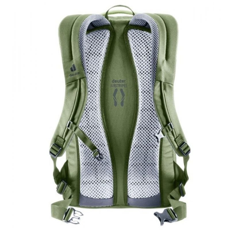 Deuter Giga mineral-grove city backpack Properties: Backpack for city, everyday, school, work, trips A large number of extremely functional pockets Document compartment An organizer pocket for office items, with countless compartments Laptop compartment for up to 15 inches Laptop secured against sliding Internal compartment for safe storage of valuables Comfortable handle and hanging loop Stretch side pockets Deuter Airstripes carrying system MeshTex shoulder straps; anatomically shaped, guarantee a comfortable range of motion Two contoured layers of foam with AirMesh padding and minimal contact at the back for maximum airflow The back panel construction made of one soft and one hard foam layer ensures excellent wearing comfort and optimal load distribution. Detachable hip belt Adjustable chest strap Anatomically shaped carrying straps 2 Rows of pillows along the back The cushions ensure proper air circulation Key clip Padded, sturdy base PFAS free Material : 300D Ripstop polyester 600D polyester
