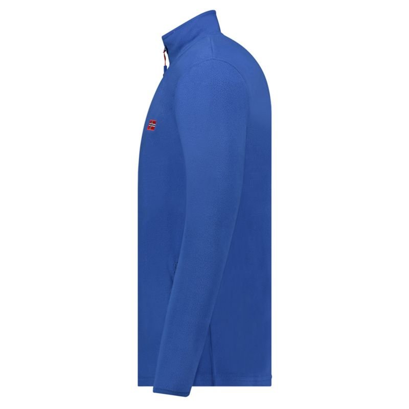 Properties: Color: Royal Blue Type: Men’s fleece with zipper Material: 100% polyester – soft, durable and easy to care for Material weight: approx. 280 g/m² – ensures adequate thermal insulation Cut: Regular fit – classic, slightly fitted cut Zipper: Full zip with chin guard Pockets: Two side zip pockets + chest pocket Finishes: Elastic cuffs and bottom of the sweatshirt – better fit, protection against cold Logo: Geographical Norway embroidered logo on chest and sleeve Purpose: Tourism, outdoor, everyday use, sports Wash at 30°C Do not bleach Do not tumble dry Do not iron Do not dry clean