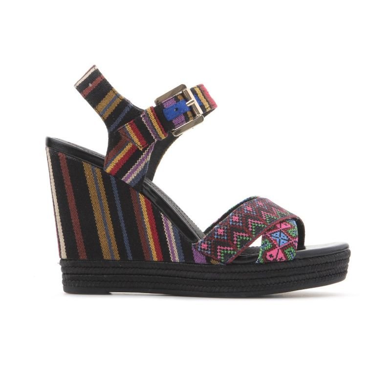 Attractive women’s shoes with a 10 cm wedge for the warmer season. Properties: The dark textile upper is made of two colored materials with different structures. An additional decoration is a gold buckle that allows you to adjust the strap around the ankle and a finish around the sole in the style of a double black braid. The perforated black sole harmonizes with the whole. Geox Respira technology – a patented perforated shoe sole, built on the basis of a membrane with micropores that absorbs and releases sweat, while preventing water from entering the shoe.