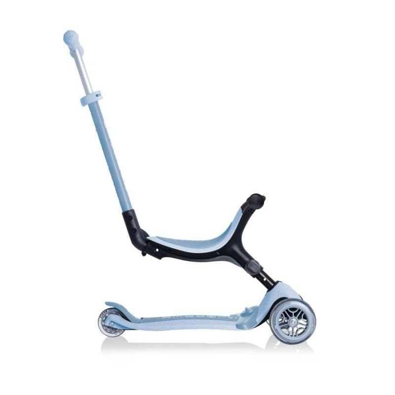 Globber GO multifunctional vehicle • UPFOLDABLE PLUS ECOLOGIC Made of 100% GRS plastic and biodegradable wheat straw* The eco-friendly packaging is made of recycled paper and is plastic-free. GO • UPFOLDABLE PLUS ECOLOGIC is available in subtle, pastel colors inspired by nature. GO • UPFOLDABLE PLUS ECOLOGIC is easy to assemble and transform, thanks to its 100% tool-free design. The vehicle offers 3 modes: ride-on, walking bike and scooter. Simple and intuitive transformation between modes using a solidly designed combination of buttons and knobs. GO • UP FOLDABLE PLUSECOLOGIC is made of 100% GRS plastic and biodegradable wheat straw*. GRS is an international protocol that verifies the recycled content of end products. Using GRS plastic saves tons of waste from landfills and mitigates the environmental impact of production. Wheat straw is a bioplastic that is 100% renewable. Using wheat straw diverts waste streams, biodegrades, and helps break down other plastics. Choose Globber. Choose more eco-friendly! An eco-friendly all-in-one scooter with a seat that converts to a ride-on bike, a walker, and a toddler scooter. The ride-on and walker modes are designed for toddlers aged 15-36 months, while the scooter mode is for children aged 3-7+. Made from 100% GRS plastic and biodegradable wheat straw* as a sustainable choice for families. 100% tool-free design allows you to easily switch between different modes without the need for tools or screws – GO • UP FOLDABLE PLUS ECOLOGIC has spring-loaded buttons and knobs that smoothly transition from ride-on to scooter mode. The patented folding system allows for folding and stroller mode. Thanks to the easy-to-use side button, you can easily carry and store the GO•UP FOLDABLE PLUS ECOLOGIC in a small space. Globber’s patented steering lock system prevents the front wheels from turning, helping children learn and master balance. Adjustable Scooter with Seat: 2-position TPR seat height adjustment (23.9cm or 27.4cm from the ground), adjusted by a tool-free knob on the side, and 3-position T-bar height adjustment (67.5cm, 72.5cm, 77.5cm from the ground) for a comfortable ride. Its ultra-low, metal-reinforced structure supports up to 50 kg and features a wide, non-slip composite deck for a safe ride. A long, wide, removable footrest provides added comfort and safety when using the scooter. High-quality, high-rebound 121mm PU cast front wheels mounted on ABEC 5 bearings and a single 80mm PU cast rear wheel for a smooth ride. An extra-long and wide composite rear brake ensures effective braking and extends wheel life. 100% tool-free design 100% tool-free design allows you to easily switch between different modes without the need for tools or screws – GO • UP FOLDABLE PLUSECOLOGIC has spring-loaded buttons and knobs that allow you to smoothly transition from ride-on to scooter mode. Adjustable seat and handlebar for maximum comfort The eco-friendly GO • UP FOLDABLEPLUSECOLOGIC scooter with seat has adjustment functions for maximum comfort: has a TPR saddle with 2-stage height adjustment, adjusted using a side knob without tools and a 3-step steering wheel adjustment, so it “grows” with your child. Powerful brake for safe deceleration The extra-long and wide composite rear brake provides effective braking, while the removable footrest provides added comfort and safety when riding in drive mode. Solid deck and durable wheels GO • UP FOLDABLE PLUSECOLOGIC is equipped with a very low, metal-reinforced structure that can withstand up to 50 kg and a wide, non-slip composite deck for a safe scooter ride. It has high-quality, high-rebound 121mm PU-cast front wheels mounted on ABEC 5 bearings and an 80mm PU-cast rear wheel for a smooth ride. Patented steering lock system The GO • UP FOLDABLE PLUSECOLOGIC features Globber’s patented steering lock system, which locks the front wheels of the scooter to only move forward and backward, so kids gain confidence while riding their scooter while developing their balance skills. To enter full scooter mode and enable steering, simply release the handlebar lock button located at the front of the scooter. Patented folding system Effortlessly carry and store your GO • UP FOLDABLE PLUSECOLOGIC in a compact form! Featuring a patented folding system, easily fold this 3-wheel foldable scooter into stroller mode to carry it around or roll it after a day of scootering fun. LIBRA DIMENSIONS (height / length / width) SEAT HEIGHT stroller 3.81 kg 74.4 – 87.6 x 60.02 – 72.9 x 28 cm 23.9 – 27.4 cm bike – ride-on 3.14 kg 35.7 – 38.6 x 56 x 26.7 cm scooter 2.68 kg 67.5 – 77.5 x 56 x 28 cm (* in all applicable elements)