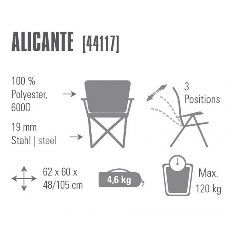 High Peak Alicante 44117 Folding Chair Properties: Folding camping chair with high backrest. Reliable construction made of metal rods. The travel seat is upholstered with soft material. An additional advantage of the chair is the adjustable backrest angle. The comfortable armrest can hold a bottle or cup. The chair can be packed in a cover with a handle for easy transport. Maximum load: 120 kg Dimensions: 62 x 60 x 48/105 cmWeight: 4.6 kg Material: 100% polyester 19 mm steel