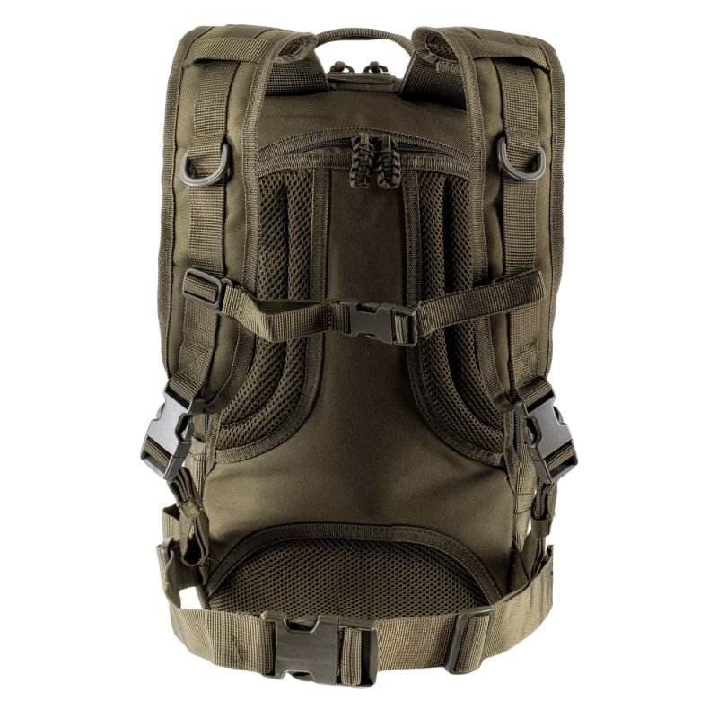 Magnym Fox Backpack 92800047859 Properties: The tactical and functional Fox 25 l backpack from the British company Magnum is also perfect as an everyday backpack. It is made of extremely strong polyester, which is resistant to abrasion and tearing. Additionally, it is covered with rubber on the inside, which makes it waterproof. The backpack has: 2 spacious main compartments, two front pockets and a rear pocket on the back, e.g. for a Camelback. All pockets are closed with two-way zippers and have comfortable handles. The main compartment opens along its entire length and has two pockets inside: one zippered and one mesh. Thanks to the many pockets, there is no problem keeping your luggage organized. Profiled and adjustable shoulder straps have vertical straps for mounting additional accessories. The backpack has a stiffened back and a reinforced carrying handle. The system of external webbing straps allows for the attachment of modular pouches, while the compression straps allow you to adjust the backpack to the actual load. The adjustable hip and chest straps stabilize the backpack and improve weight distribution without straining the spine. Velcro fastening system, allowing for attaching any labels (titles, specializations, national colors, etc.). Functional and reliable, equipped with a webbing system and pockets, closed with zippers – the perfect backpack for versatile use. Technical data: Model: FOX Manufacturer: Magnum, UK Material: 100% polyester Three large pockets Two smaller pockets on the front The backpack is trimmed with mounting tapes on the front and sides. Hip belt Chest strap Width adjustment using compression straps Soft-finished, fully adjustable harness Camelbak pocket Pocket organizers Comfortable handles on the locks Double-pole locks D-rings Adjusting the carrying system Velcro fastening system Material: Polyester Color: green