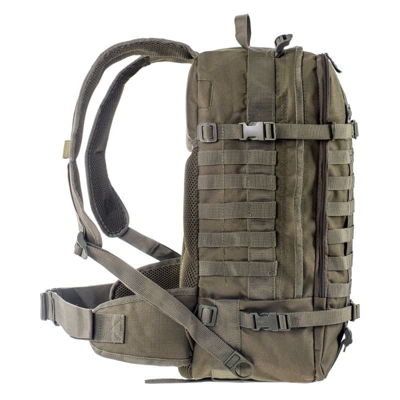Magnum Taiga 45L Backpack Properties: Contoured back with ventilation system. Reinforced construction. Side and front fastening straps. Zippers with large sliders. Compression straps. Organizer. Adjustable hip belt. Output to the H2O system Capacity: 45L Dimensions: -height: 51 cm -width: 35 cm -depth: 20 cm Material: 100% Polyester Color: green