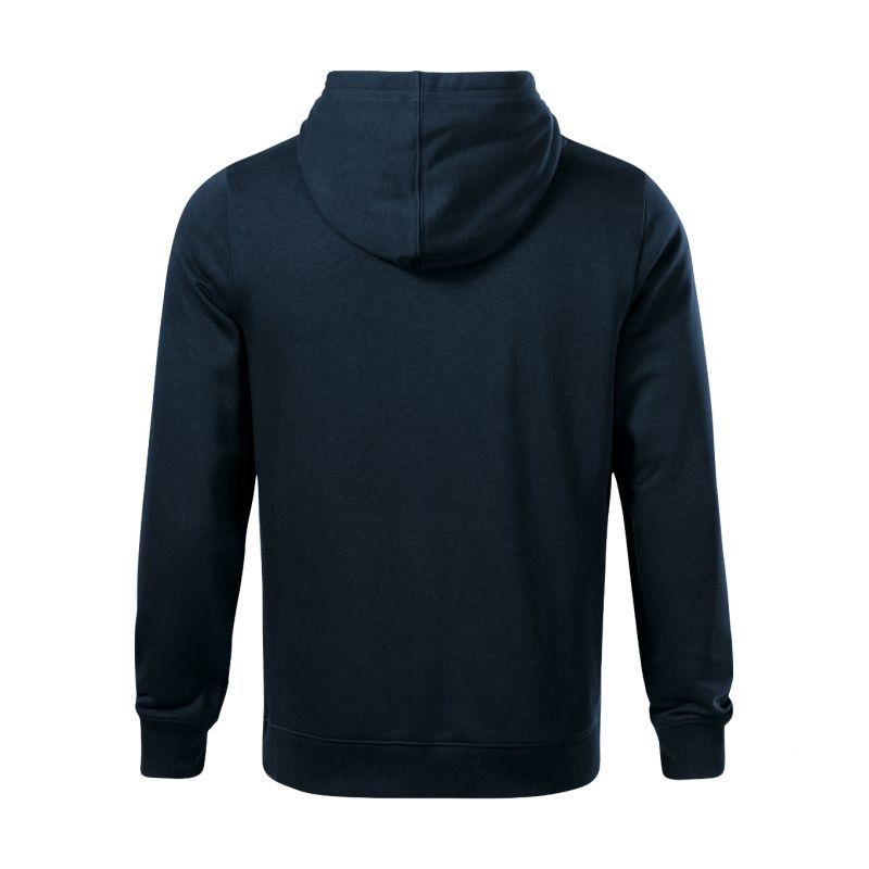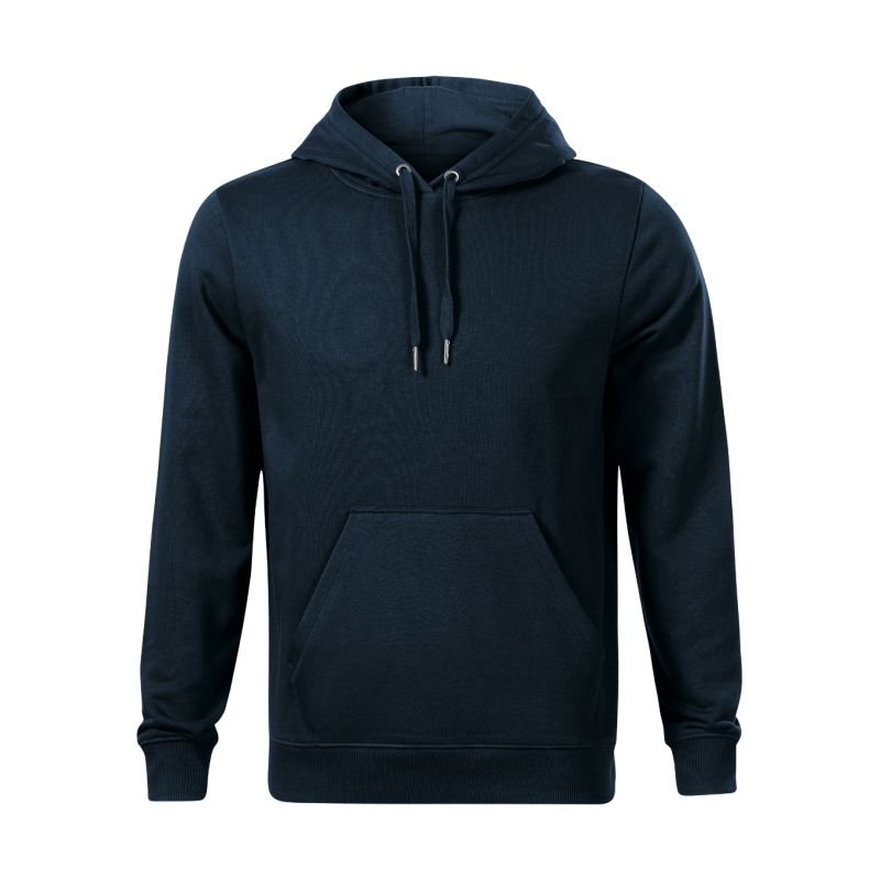 Properties: Men’s Malfini sweatshirt. Straight cut with side seams. Lined hood with drawstring. The inner back part of the hem is reinforced with a colored tape made of the outer material. Kangaroo pocket. Ribbed knit bottom hem and sleeve cuffs. Material: cotton, polyester Color: navy