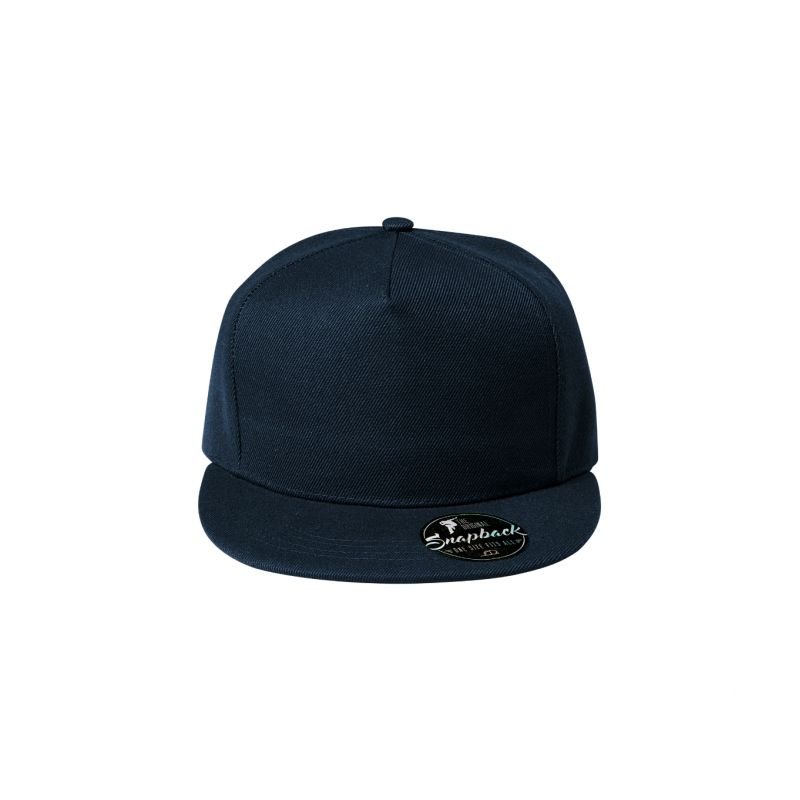 Malfini Rap 5P Cap Properties : five-panel cut glued front panel flat visor with stitching embroidered ventilation holes sweat-absorbing headband snapback – size adjustable with plastic straps removable sticker on the visor Material: 100% cotton Color: navy