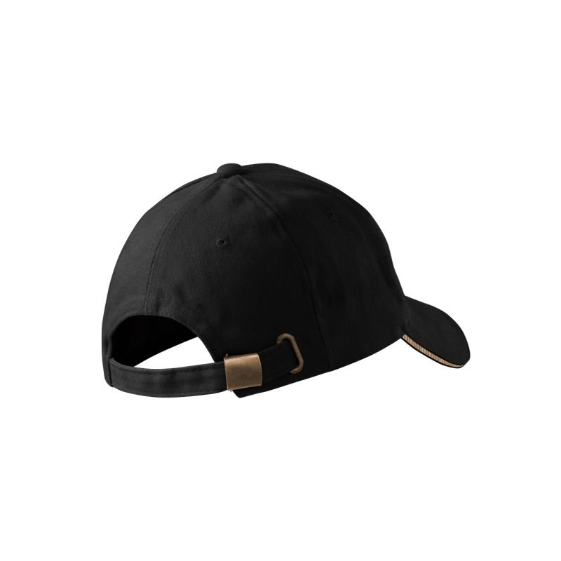Malfini Sandwich 6P Cap Properties: Combed twill six-panel cut 2 front panels connected embroidered slightly curved visor with contrasting stripe embroidered ventilation holes sweat-absorbing headband size adjustable with a brass clip Material: 100% cotton Color: black