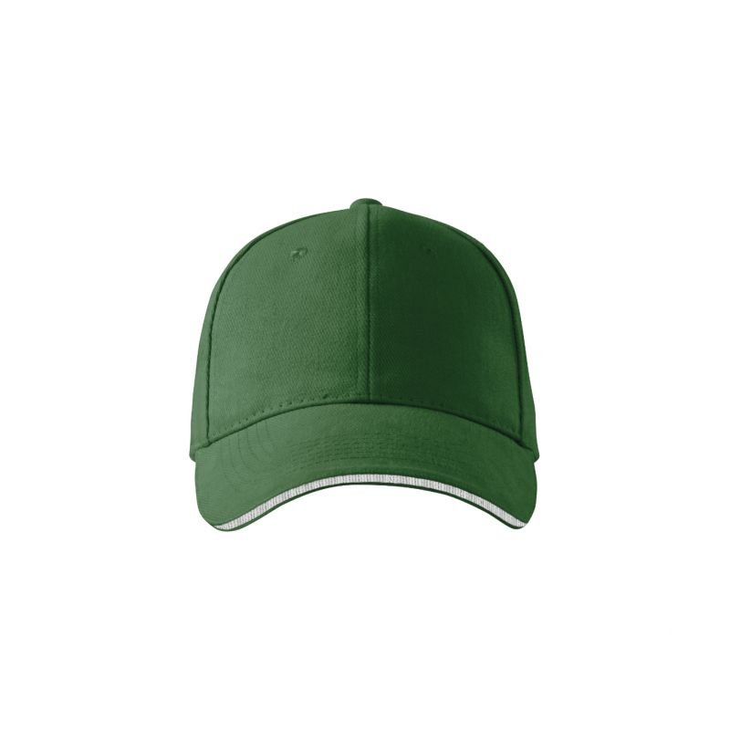 Malfini Sandwich 6P Cap Properties: Combed twill six-panel cut 2 front panels connected embroidered slightly curved visor with contrasting stripe embroidered ventilation holes sweat-absorbing headband size adjustable with a brass clip Material: 100% cotton Color: bottle green