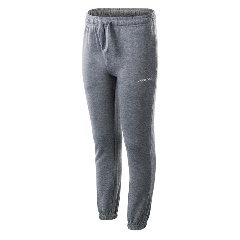 Properties: Martes boys’ trousers. Loose fit. Adjustable waist width. Legs finished with cuffs. Open side pockets. Material: polyester, cotton Color: gray