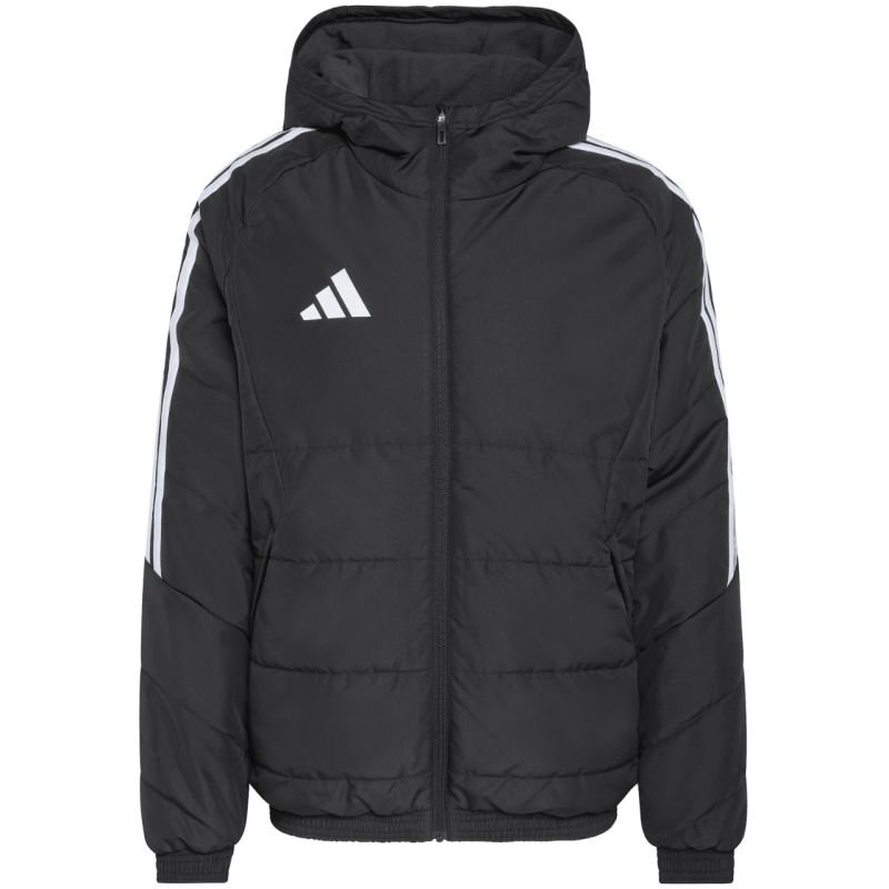 adidas Tiro 26 Winter Men’s Jacket, Black JZ4109 This adidas men’s jacket from the Tiro football line is also perfect for everyday wear. Synthetic fill helps maintain optimal body temperature. Traditional cut. Full-length zipper. Zippered side pockets. Fixed, non-adjustable hood set on a high stand-up collar. Stripes on the sleeves. Subtle logo on the front. Specifications: Ripstop material: 100% recycled polyester. Regular fit. Full-length front zipper. Water-resistant properties. Climawarm insulation.