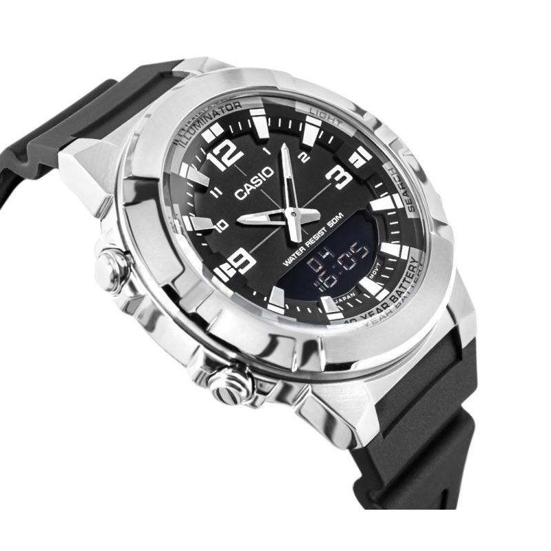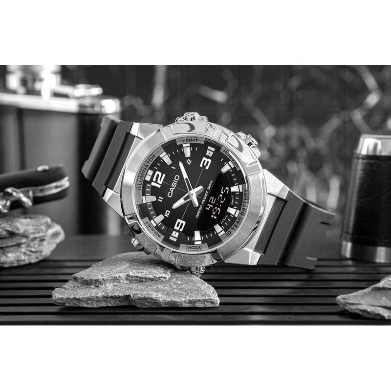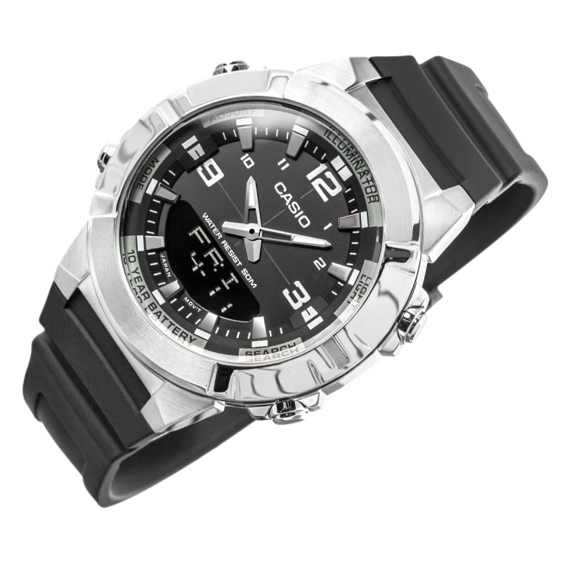 Men’s Watch CASIO AMW-870-1AVDF + BOX The CASIO AMW-870-1AVDF is a watch for the man who doesn’t want compromises – the austere, hexagonal case, expressive 3D dial, and blend of classic analog style with digital precision speak for themselves. Three alarms, a timer, stopwatch, world time, and Telememo memory provide complete control over your daily routine – from the office to outdoor adventures. Water resistance to 50 m and a 10-year battery guarantee it’s ready when you are. This watch doesn’t just measure time – it defines it. Product description: Brand : CASIO Symbol : AMW-870-1AVDF Mechanism : Battery-powered quartz, with hour and minute hands Dial: Analog – Digital 3D Case : Stainless steel Glass : Mineral Strap: Resin material Standard functions (digital dial): hour, minute, second, AM/PM, month, date, day of the week Additional features: World time in 30 cities (29 time zones) / 12/24 format / Stopwatch 1/100 second / Hourly time signal / Automatic calendar / Countdown timer / 3 alarms (1 with snooze function) / Hourly time signal / TELEMEMO (30 memory entries) Backlight: Amber LED with Afterglow function Water resistance: 5 BAR – resistant to contact with water Anti-allergic : Yes – nickel-free Battery: 10-year battery life (10 Year Battery) Dimensions in mm: Case: 44 mm Dial: 34 mm Thickness: 12.2 mm Strap width: 35/19 mm Circumference: 145 mm – 215 mm Color: Case: silver Strap: black / Buckle: silver 3D dial : black + silver elements Hands/Indices: silver + Neobrite coating 10-Year Battery Life – Reliability and Convenience with Casio Casio watches equipped with a CR2025 battery provide up to 10 years of uninterrupted operation, eliminating the need for frequent battery replacement. This is an ideal solution for those who value reliability, economy, and convenience in everyday use. Thanks to the long battery life, you can enjoy your watch without worrying about its performance, regardless of the conditions. QUARTZ MOVEMENT – accuracy and reliability This reliable mechanism, used in classic Casio digital watches, combines functionality with long battery life. Replacing the battery is the only regular maintenance required when using a quartz watch. It’s an ideal choice for active individuals who value comfort and simplicity. MINERAL GLASS – OPTIMAL PROTECTION AND EASY TO READ DIAL Mineral glass with silicon is an excellent choice for watches – it’s harder than synthetic glass, scratch- and damage-resistant, yet flexible, reducing the risk of breakage. It also provides excellent clarity and brightness, making it much easier to read the time quickly and clearly in various lighting conditions. 3D SPATIAL DIAL + CONVEX GLASS The combination of analog hands and a digital display is embedded deep within the dial structure, creating a dynamic, technical effect with the layered construction. The design is complemented by a slightly domed crystal, which not only adds depth to the composition but also emphasizes the watch’s solidity and style. This combination emphasizes the depth and precision of the workmanship with every wrist movement. WATER RESISTANCE 5 BAR / 50M – GREATER WATER RESISTANCE The watch is resistant to everyday splashes, rain, and hand washing, and can also withstand brief immersion in water, such as while bathing or showering. However, it is not intended for swimming or diving. USEFUL FEATURES World time in 30 cities allows you to quickly check the time in various corners of the world, which is useful for traveling and international contacts. A precise 1/100th-second stopwatch and an extended timer with a countdown of up to 24 hours are perfect for workouts, meetings, or important tasks. Three daily alarms (including one with snooze) and an hourly time signal will help you stick to your schedule. The automatic calendar runs maintenance-free until 2099, and the amber LED backlight ensures readability even after dark. TELEMEMO 30 – YOUR DIGITAL NOTEBOOK With Telememo 30, you always have your contacts where you need them – on your wrist. With capacity for up to 30 data sets, each with an 8-character name and 16-digit phone number, you have the most important information at your fingertips, even if your phone fails or you’re out of range. Plus, a screen displays available memory capacity and automatic data sorting. MULTIFUNCTIONAL ALARM WITH SNOO FUNCTION Three independent daily alarms, including one with a snooze function, help you stay on track with your day, reminding you of important tasks, workouts, and meetings. The snooze function gives you a few extra minutes when you really need them—perfect for mornings and short resetting breaks throughout the day. RESIN STRIP (Resin material) Very lightweight, ensuring comfort in everyday use, especially during physical activity. Resin is resistant to mechanical damage, such as cracks and breaks, making it an ideal choice for watches intended for intensive use. Resin is resistant to moisture, water, and temperature changes, making these straps ideal for harsh environments. Resin straps are easy to clean – simply wipe them with a damp cloth to remove dirt. THE SET INCLUDES: Original CASIO watch CASIO branded box Warranty card with user manual CASIO WATCH – TIME AT ITS BEST Thanks to exceptional attention to detail and rigorous durability testing, Casio offers timepieces that have earned the title “watches for generations.” It’s a brand trusted by millions of people around the world, from globetrotters and athletes to those seeking everyday elegance. Casio isn’t just a watch—it’s durability, innovation, and history etched into every second.