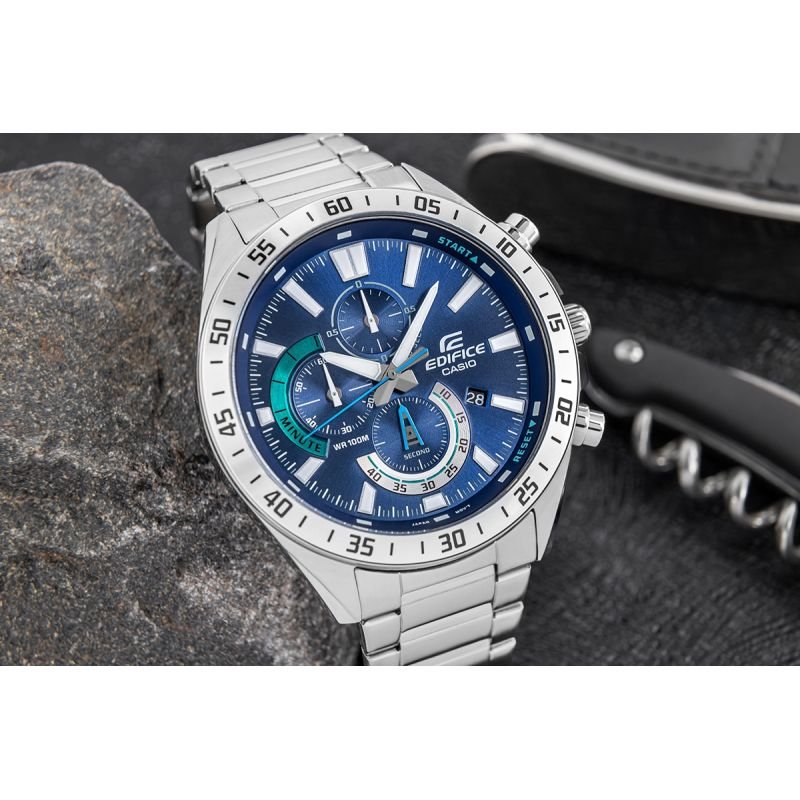 Men’s Watch CASIO EDIFICEEFV-620D-2AVUEF + BOX Go for a bold style with the classic EDIFICE EFV-620 chronograph! Choose a watch that combines precise details and an impressive, large design (55 mm case diameter) – and stand out. This motorsport-inspired model features dynamic color combinations and expressive subdials, creating a style that exudes speed and intelligence. The watch features a date and day function, as well as chronograph functions: 1/10th of a second stopwatch, stopwatch minutes, and stopwatch seconds. Water resistance to 10 bar allows you to confidently take it to the pool, workout, or water adventures, while the fluorescent backlight ensures you have full control of the time even after dark. PRODUCT DESCRIPTION: BRAND: CASIO COLLECTION: EDIFICE MODEL: EFV-620D-2AVUEF MOVEMENT: Precise quartz DIAL: Analog with date and day function, chronographs: seconds, minutes and 1/10 second stopwatch CASE: Round, made of high-quality stainless steel GLASS: Mineral, scratch-resistant BRACELET: Segmented, stainless steel with an elegant finish FLUORESCENCE: Hints WATER RESISTANCE: 10 BAR – resistant to contact with water / swimming ANTI-ALLERGIC: Yes – nickel-free, safe for the skin WATCH DIMENSIONS IN MM: Case: 55 mm Dial: 50.5 mm Case thickness: 11.8 mm Bracelet: 24 mm wide Bracelet circumference: 220 +/- 5 mm – adjustable for a perfect fit COLOR: Case: silver Dial: navy blue Bezel: silver Indexes: silver / fluorescence Hands: silver / fluorescent Second hand: blue Watch bracelet: silver, matte finish QUARTZ MOVEMENT – RELIABLE PRECISION EVERY DAY The quartz movement guarantees high timekeeping accuracy, eliminating the need for daily winding. This makes the watch incredibly convenient to wear – periodic battery replacement is all that’s needed. Thanks to the stable vibrations of the quartz crystal, the watch maintains exceptional accuracy and reliability. FULL TIME CONTROL – CHRONOGRAPHS Three subdials function as stopwatches for seconds, minutes, and a 1/10th-second stopwatch , allowing for incredibly precise timekeeping. Thanks to additional buttons on the case, operating the stopwatch is intuitive and quick, making the watch ideal for both everyday use and more demanding situations, such as sports or driving. MINERAL GLASS – OPTIMAL PROTECTION + CLEAR DIAL Mineral glass with silicon is harder than synthetic glass, scratch- and damage-resistant, yet flexible, reducing the risk of breakage. It also provides excellent clarity and brightness, significantly facilitating quick and clear reading of the time in various lighting conditions. FLUORESCENT INDICATORS + INDEXES The ability to glow in the dark offers excellent readability in all conditions. This effect not only adds a modern touch but also provides exceptional practicality. PRECISE FUNCTIONAL LAYOUT IN THE CASIO EDIFICE WATCH The watch face layout and additional functions have been designed to ensure maximum readability, intuitiveness, and ease of use – both in everyday situations and during sporting events. Perfectly balanced hands ensure precise timekeeping. 10 BAR WATER RESISTANCE – RELIABILITY IN EXTREME CONDITIONS The watch easily handles accidental splashes, rain, and even contact with water during activities like swimming and recreational water sports. Its robust construction ensures durability in the urban jungle and during outdoor adventures. ADDITIONAL FUNCTIONALITY – DATE STAMP The date display on this model is located at 4 o’clock and features a classic window format that displays the current day of the month. The white background with black numerals ensures excellent readability, and its position on the dial makes it easily visible without detracting from the watch’s clean design. STRENGTH AND DURABILITY OF THE BRACELET Crafted from premium stainless steel, it combines durability with a luxurious finish. Its robust construction not only guarantees reliability but also ensures that the watch will fit perfectly, no matter what the day brings. A precise clasp with an embossed logo completes the look, adding a touch of class and unique character. Tri-Folding Clasp – Comfort and Safety It consists of three segments that fold and unfold for security, comfort, and an elegant look. A multi-stage mechanism prevents accidental opening of the watch, and the clasp is discreet and complements the bracelet. THE SET INCLUDES: Original CASIO Edifice watch CASIO EDIFICE branded box Watch pillow Warranty card with user manual EDIFICE. A symbiosis of innovative technology and the highest precision. The CASIO EDIFICE proves its versatility. Whether you choose the classic model with a steel bracelet, the sporty variant with an elastic strap, or the elegant version with a genuine leather strap – every EDIFICE on your wrist combines sporty style with a sophisticated look. All models feature a solid steel case, scratch-resistant mineral glass and innovative technologies that make EDIFICE more than just a watch. Some models feature a screw-down caseback, ensuring maximum security and convenience—protecting the precision mechanisms and enabling easy battery replacement. CASIO EDIFICE watches are water-resistant to 10 bar, with some models even up to 20 bar, making them suitable for both everyday wear and demanding conditions.