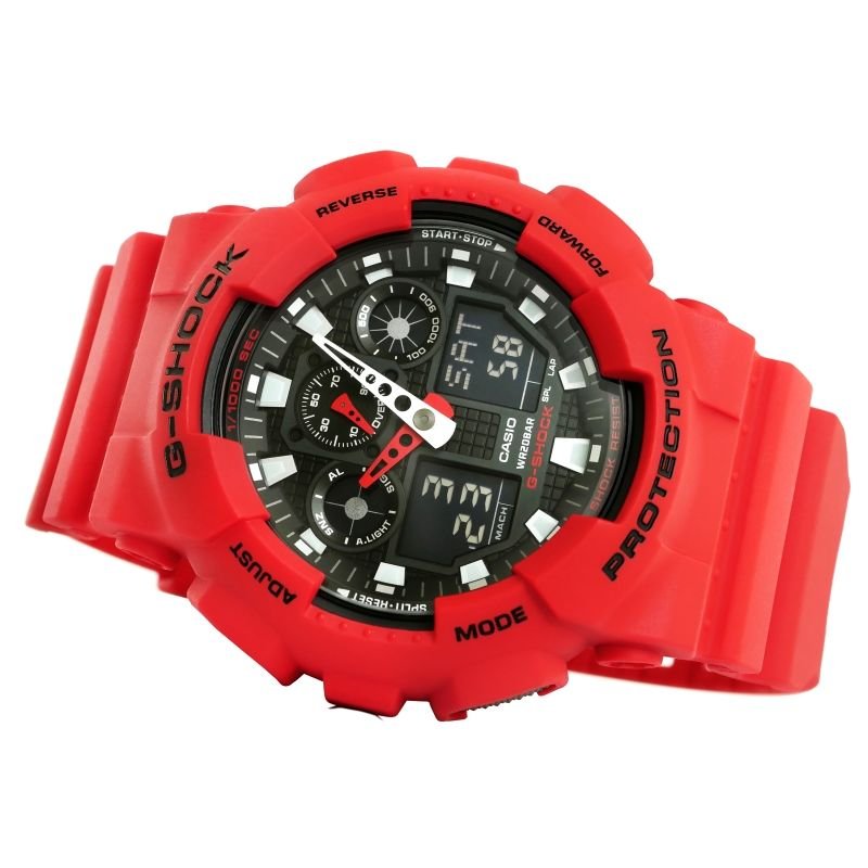 Casio G-Shock Casio watches are known and loved worldwide. Their reliability, durability, and innovation have earned them a cult following among watch enthusiasts. Today, Casio offers popular collections such as G-SHOCK, Baby-G, EDIFICE, Pro Trek, Retro, Sheen, and Casio Collection. In 1983, CASIO created the first G-SHOCK—a watch that could not be destroyed. The Casio G-Shock is an iconic watch that set trends among sports watches. The letter -G stands for Gravity, because the resistance of the watches has been confirmed by tests on over 200 prototypes that were subjected to severe tests to prove their extreme strength and durability. G-Shock watches are equipped with the famous G-Shock shock-resistant system. The watches are made using Shock Resistant technology, which is characterized by very high resistance to shocks and impacts. The plastics used guarantee extraordinary durability, lightness and ensure great comfort, lightness and exceptional ease of use. Silicon-based mineral glass offers a hardness of 4 (standard version) to 5 (hardened version) on the Mohs scale. The Casio G-Shock men’s watch makes an ideal gift for a loved one. Any man who receives this model will surely be pleased and appreciate its value. Casio G-Shock 20 Bar Men’s Watch For Diving + BOX Brand: G-Shock Mechanism: Precise time display is ensured by a quartz movement – one of the best quartz mechanisms used in watches with a higher presence Dial: Analog-quartz. Stopwatch, Alarm x5, Alarm clock. Date. Backlight – This watch features an LED backlight, providing a subdued, yet bright light that illuminates the dial. World time, multiple time zones. Automatic calendar with pre-programmed dates up to 2099. The watch automatically adjusts the date for shorter months. 1/10-second timer. The watch is equipped with a backward countdown function, adjustable from 1 second to 24 hours. Case: High-quality plastic Glass: Mineral with increased resistance to scratches and accidental impacts Strap: High-strength plastic Water resistance: 20 BAR Backlight: LED Protection: Against the influence of magnetic fields PLATING Technology: An innovative ion-based sputtering method for the watch’s coating. This method creates a uniform, smooth surface with increased abrasion resistance. Anti-allergic: Nickel-free – safe for allergy sufferers Dimensions in mm: Envelope: 50 Shield: 37 Thickness: 17.3 Strap width: 28 Belt circumference: 150-220 Color: Envelope: red Dial: black Indexes: blue Hands: silver-red Strap: red Watch functions The CASIO G-SHOCK GA-100B-4AER Men’s Watch features: Stopwatch, Alarm x5, Alarm clock, Date. Backlight – This watch features an LED backlight that illuminates the dial with a subdued yet bright light. World time display, multiple time zones. Automatic calendar with pre-programmed dates up to 2099. The watch automatically adjusts the date for shorter months. 1/10-second timer. The watch also features a reverse countdown function, adjustable from 1 second to 24 hours. Extremely durable construction The watch is made of high-strength plastic. The Casio G-Shock’s construction is crafted with incredible precision. Casio’s combined expertise has resulted in the world’s most durable watch, the G-Shock series. Longevity – high hardness, difficult to break, does not deform. Resistant surface – it is not soft, so it is more difficult to scratch or wipe. Stable color – it has its own UV protection, so the impact of light does not change its color, which is stable. Corrosion-resistant – the surface is resistant to oxidation and corrosion, so it can come into contact with water and does not tarnish. Varied surface – can have a shiny, polished and matte surface. Hygienic – easy to clean and resistant to chemicals. Resistance to: temperature, dust, water, impacts and shocks . Hypoallergenic – ideal for allergy sufferers, people-friendly steel. Prestige – a high-class material that creates the impression of solidity, high quality and professionalism. Plastic strap The strap on Casio G-Shock watches is made of extremely durable plastic that complements the watch’s overall design. This allows it to be used in demanding conditions, such as diving. Its metal buckle is resistant to corrosion and salt water, and the G-Shock logo is an additional guarantee of the watch’s originality. Mineral glass A watch with mineral glass is a good choice if you want to wear your watch comfortably every day. This type of glass, made of silicon, is much harder than synthetic glass. Mineral glass primarily serves a protective function—it shields the watch face from damage and dirt. Mineral glass is also very flexible, less susceptible to shattering and more durable during everyday use. Waterproof The watch has a water resistance class of 20 BAR, which means that the watch is 100% intended for diving. The watch is resistant to: rain flooding splashes washing hands bath fun in the pool swimming diving Now you don’t have to part with your favorite watch even for a moment. In the set you will receive: – original Casio G-Shock watch – original box with tin – warranty card