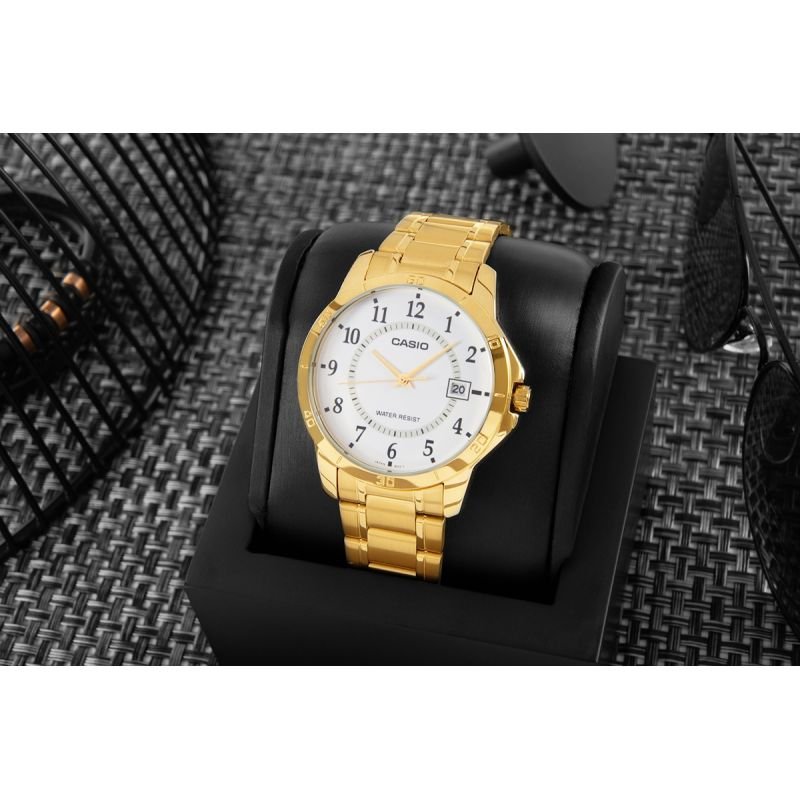 Men’s Watch CASIO MTP-V004G-7BUDF + BOX This men’s model from the CASIO collection features a classic 40mm case and stainless steel bracelet, both coated with a durable gold-tone ion plating. The bright dial with clear, black Arabic numerals ensures excellent readability, while an additional minute scale in the inner ring facilitates timekeeping. A practical date display at 3 o’clock allows for a quick glance at the current day of the month. Water resistance (WR) makes the watch suitable for everyday wear, for example, while washing hands or in rainy weather. The watch is powered by a precise quartz movement, guaranteeing reliable operation. Product description: Brand : CASIO Code : MTP-V004G-7BUDF Mechanism : Precise battery-powered quartz / 3 hands (hour, minute, second) Dial: Analog Case : Stainless steel with ion coating Glass : Mineral Bracelet: Stainless steel with ion plating Additional features: Date stamp Backlight: None Water resistance: Water Resist (WR) – splash-proof Anti-allergic : Yes – nickel-free Battery: 3-year battery life Dimensions in mm: Case: 40 mm Dial: 32 mm Thickness: 10 mm Bracelet width : 20 mm Circumference: 150 mm – 205 mm +/- 5 mm – adjustable for a perfect fit Color: Case/Bracelet: gold Dial : white Hands/Seconds: gold color Digits: black QUARTZ MOVEMENT – RELIABLE PRECISION EVERY DAY The quartz movement guarantees high timekeeping accuracy, eliminating the need for daily winding. This makes the watch incredibly convenient to wear – periodic battery replacement is all that’s needed. Thanks to the stable vibrations of the quartz crystal, the watch maintains exceptional accuracy and reliability. MINERAL GLASS – OPTIMAL PROTECTION + CLEAR DIAL Mineral glass with silicon is harder than synthetic glass, scratch- and damage-resistant, yet flexible, reducing the risk of breakage. It also provides excellent clarity and brightness, significantly facilitating quick and clear reading of the time in various lighting conditions. MINUTE BY MINUTE – ADDITIONAL SUPPORT The minute scale on the inner ring allows for more precise time reading – ideal for keeping track of short periods, such as meetings or breaks. It makes it easy to quickly track minutes without guessing. It’s a practical detail that enhances the watch’s everyday functionality. ADDITIONAL FUNCTIONALITY – DATE STAMP The date display on this model is located at 3 o’clock and features a classic window format that displays the current day of the month. The white background with black numerals ensures excellent readability, and its location on the dial makes it easily visible without detracting from the watch’s clean design. STRENGTH AND DURABILITY OF THE BRACELET Crafted from premium stainless steel, it combines durability with a luxurious finish. Its robust construction not only guarantees reliability but also ensures that the watch will fit perfectly, no matter what the day brings. A precise clasp with embossed logo completes the look, adding a touch of class and unique character. This is a bracelet that says “strength” and “style” in one decisive movement. Tri-Folding Clasp – Comfort and Safety It consists of three segments that fold and unfold for security, comfort, and an elegant look. A multi-stage mechanism prevents accidental opening of the watch, and the clasp is discreet and complements the bracelet. WATER RESISTANCE WR (Water Resistant) It offers the protection and reliability you need for everyday use. The watch is water-resistant enough to withstand many common everyday situations, such as sudden rainfall or contact with water while washing your hands. THE SET INCLUDES: Original CASIO watch CASIO branded box Warranty card with user manual CASIO WATCH – TIME AT ITS BEST Thanks to exceptional attention to detail and rigorous durability testing, Casio offers timepieces that have earned the title “watches for generations.” It’s a brand trusted by millions of people around the world, from globetrotters and athletes to those seeking everyday elegance. Casio isn’t just a watch—it’s durability, innovation, and history etched into every second.