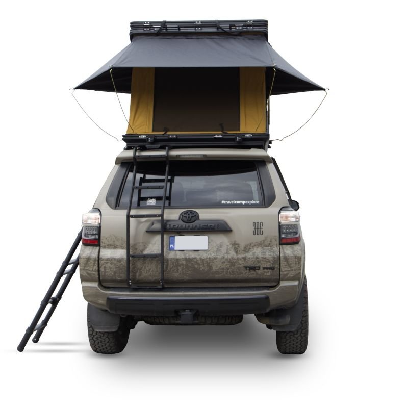 TECHNICAL DATA External tent dimensions: 210 x 142 x 120 cm (L x W x H)   Folded tent dimensions: 210 x 142 x 20 cm (L x W x H)   Mattress dimensions: 200 x 120 x 5 cm (L x W x H)   Ladder dimensions: folded 79 cm, unfolded 230 cm   Weight: 86 kg   Material color: sand   Tropic color: black   Shell color: black   Maximum static load [when stationary]: 300 kg   Maximum load of the shell [closed]: 300 kg   Mounting brackets included: fits car crossbars up to 3 cm high and 9 cm wide   Designed for 2 + 1 people   Material: Top sheet – waterproof 420D Oxford fabric (PU 2000-3000mm). Tent walls and roof: waterproof fabric (PU 2000mm) with a density of 280G.   Mattress: non-deforming memory foam   Telescopic ladder: aluminum   Actuators: stainless steel   Cover and floor: aluminum   Accessories: telescopic ladder, shoe bag, accessory pockets, LED lighting for connecting to a power bank, anti-condensation mat, tent closing handle, mounting kit