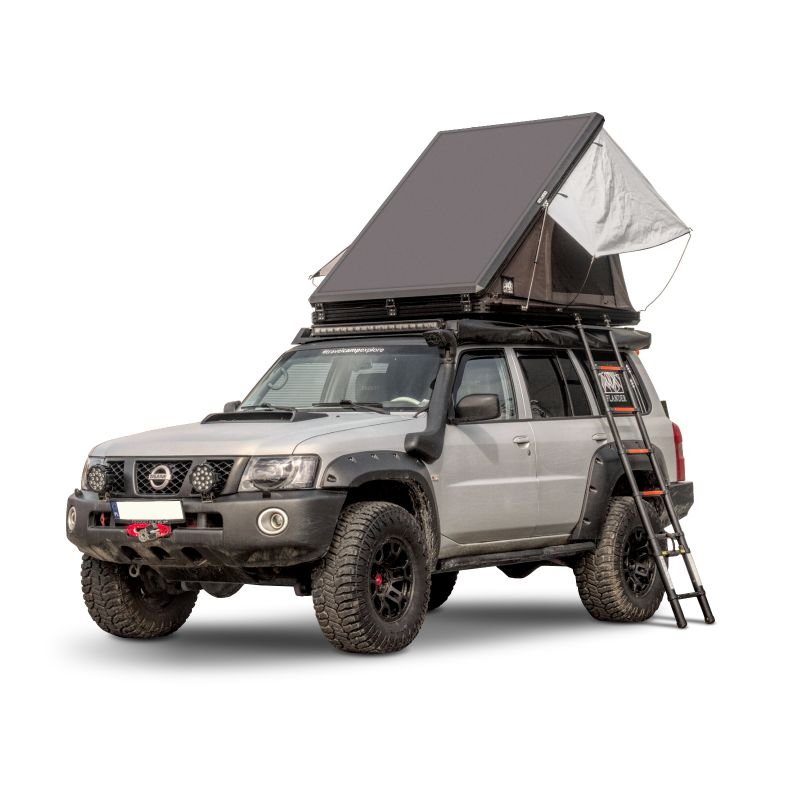 Technical data: External tent dimensions: 215 x 143 x 150 cm (L x W x H) Folded tent dimensions: 215 x 143 x 18 cm (L x W x H) Mattress dimensions: 200 x 132 x 5.5 cm (L x W x H) Ladder dimensions: folded 79 cm, unfolded 240 cm Weight: 75 kg tent, 5 kg ladder, 4 kg accessories; total 84 kg Material color: gray Shell color: black Maximum static load [when stationary]: 300 kg Maximum load of the shell [closed]: 300 kg Mounting brackets included: fits car crossbars up to 3cm high and 9cm wide Designed for 2 people Material: Top flysheet – waterproof 420D Oxford fabric (PU 2000-3000mm). Tent walls and roof : waterproof fabric (PU 2000mm) with a density of 280G. Mattress: non-deforming memory foam Telescopic ladder: aluminum Actuators: stainless steel Cover and floor: aluminum Accessories: telescopic ladder, shoe bag, accessory pockets, LED lighting for connecting to a power bank, cover for a closed tent, anti-condensation mat, bars for additional luggage (mounted on the tent), additional T-SLOT mounting screws, handle for closing the tent. Warranty: 2 years