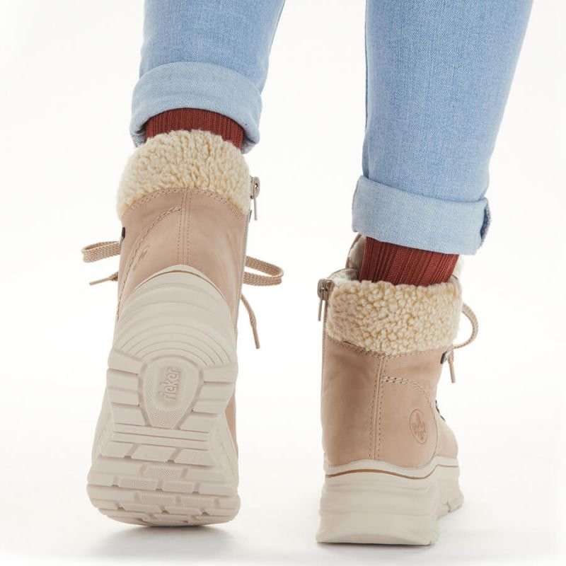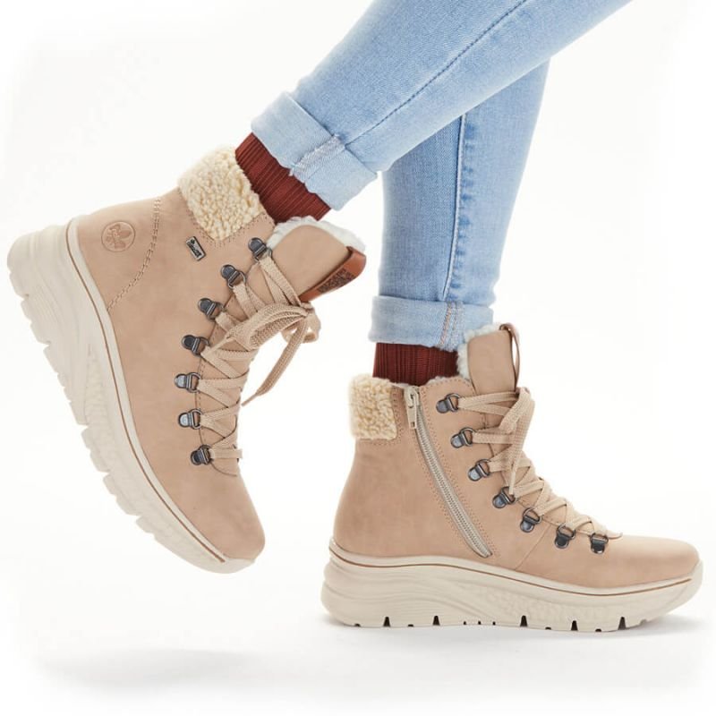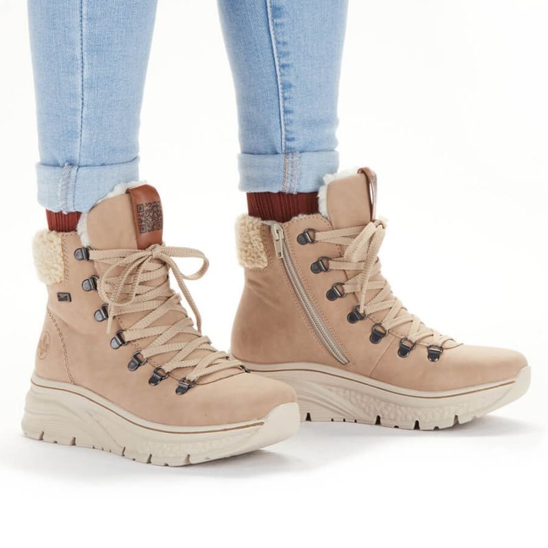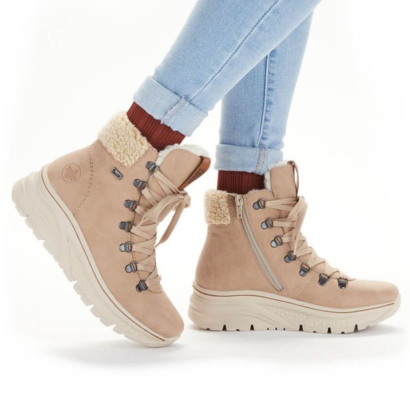 Rieker W RKR572 waterproof insulated snow boots Properties: The RIEKER-TEX membrane provides increased protection against water penetration, protection against cold and moisture, free breathing, and comfort of use. The lining is insulated with sheepskin. The MEMOSOFT insole remembers the shape of the foot and absorbs shocks. Color: beige