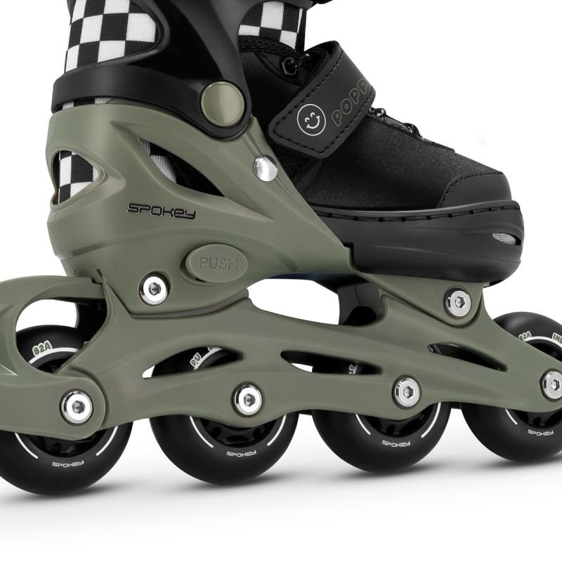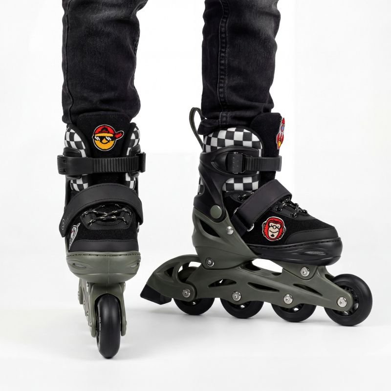 Children’s adjustable inline skates. The semi-soft boot ensures comfort while skating, and the adjustable size allows you to adapt the skates to growing feet, extending their lifespan. 82A wheel hardness works well on asphalt surfaces – they provide traction and dampen vibrations. ABEC-7 bearings enable a smooth and quiet ride. A triple fastening system (buckle, Velcro, laces) stabilizes the foot and prevents it from shifting while skating. The set includes interchangeable Velcro decorations that allow you to personalize the look of the skates. Parameters: Boot: semi-soft, adjustable Boot material: polyester, PP Frame material: PP Wheel material: PU Wheel hardness: 82A Wheel diameter: 64 mm Bearings: ABEC-7 Fasteners: two-section buckle, Velcro, laces Size: 27-30 or 31-34 Brake: TPR Set includes: 8 Velcro patches – for product personalization Max. User weight: 60 kg Recommended for: recreational riding Experience level: beginner Safety information: Personal protective equipment must be worn. Not suitable for children weighing more than 60 kg. To be used under adult supervision. Do not use in road traffic. Not for commercial use.
