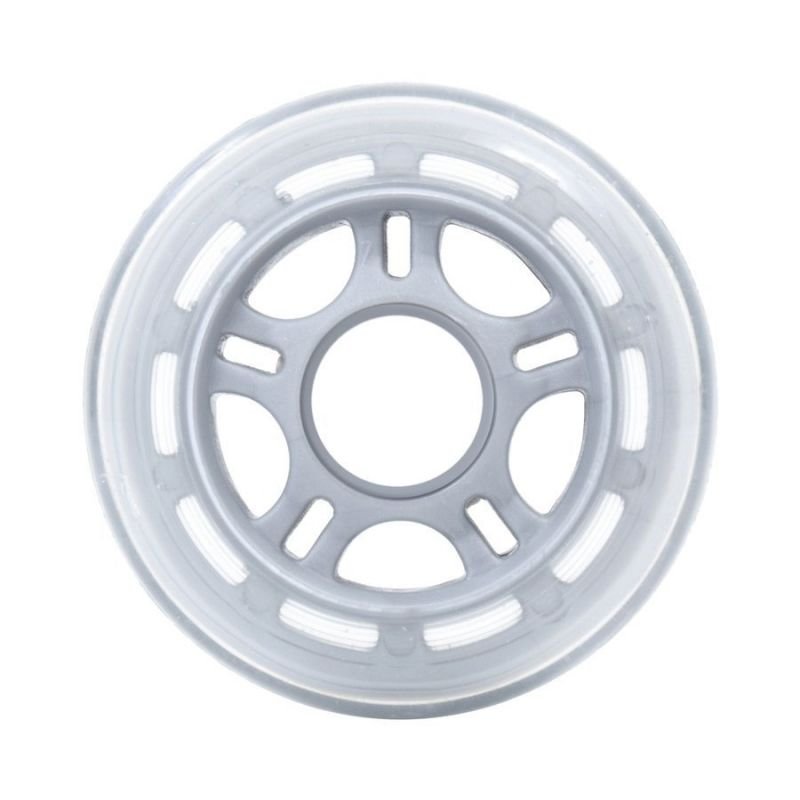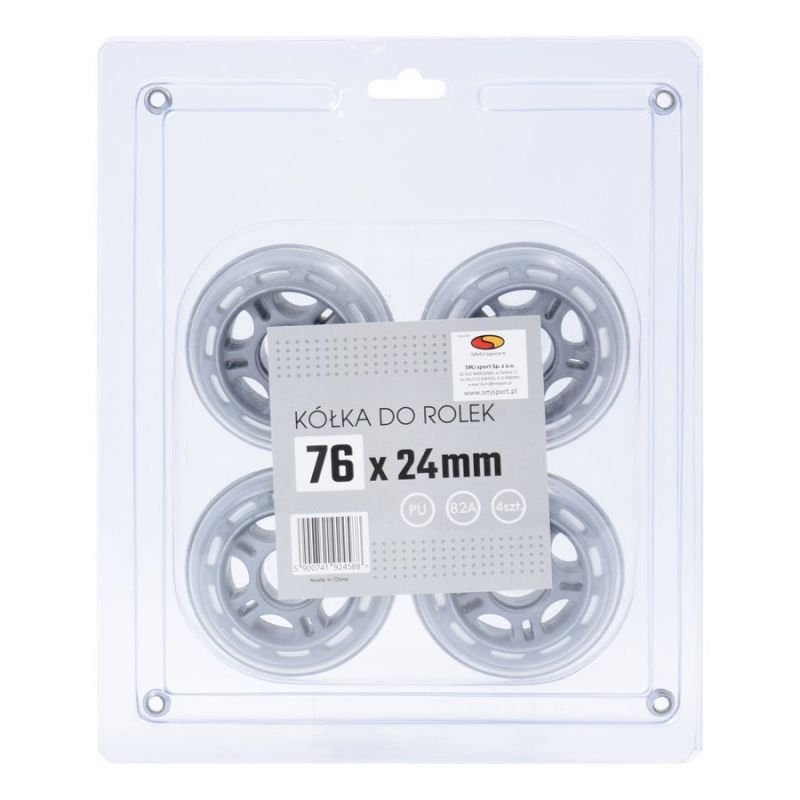 Set of roller skate wheels. Dimensions: 76 x 24 mm Material: PU Hardness: 82A Color: transparent / gray core Packaging: 4 pieces