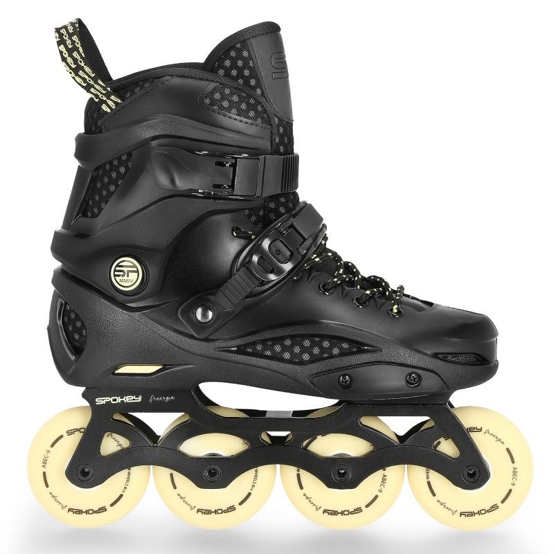 Spokey Freespo 42/43 BK inline skates SPK-929415 Properties: Spokey FREESPO roller skates: hard shell with a removable, highly ventilated insert made of honeycomb-shaped foam material, triple fastening with two buckles and laces. This allows for optimal fit and ensures safety during fast slalom, city, and freeskate skating! CNC-cut aluminum frame ensures maximum durability and strength. high-quality ABEC9 Chrome bearings, a versatile skate, designed for fast, dynamic freestyle and recreational skating, but also for starting your skating adventure, while maintaining safety thanks to its excellent technical parameters. Technical data skid: aluminum CNC bearings: ABEC9 Chrome wheels: 85A PUC wheel size: 76×24 mm size 36-39, 80×24 mm size 40-45 material: PP insole: profiled fastenings: two-section buckle, laces compliant with the standard: EN 13843 Size Insole length 36/37 23 cm 38/39 24.5 cm 40/41 26 cm 42/43 27.6 cm 44/45 29.1 cm *When choosing rollers, refer to the table. Size markings on the packaging may differ from those shown above. The shell and length of the insole remain the same, e.g. for sizes 38 and 39 it is identical.