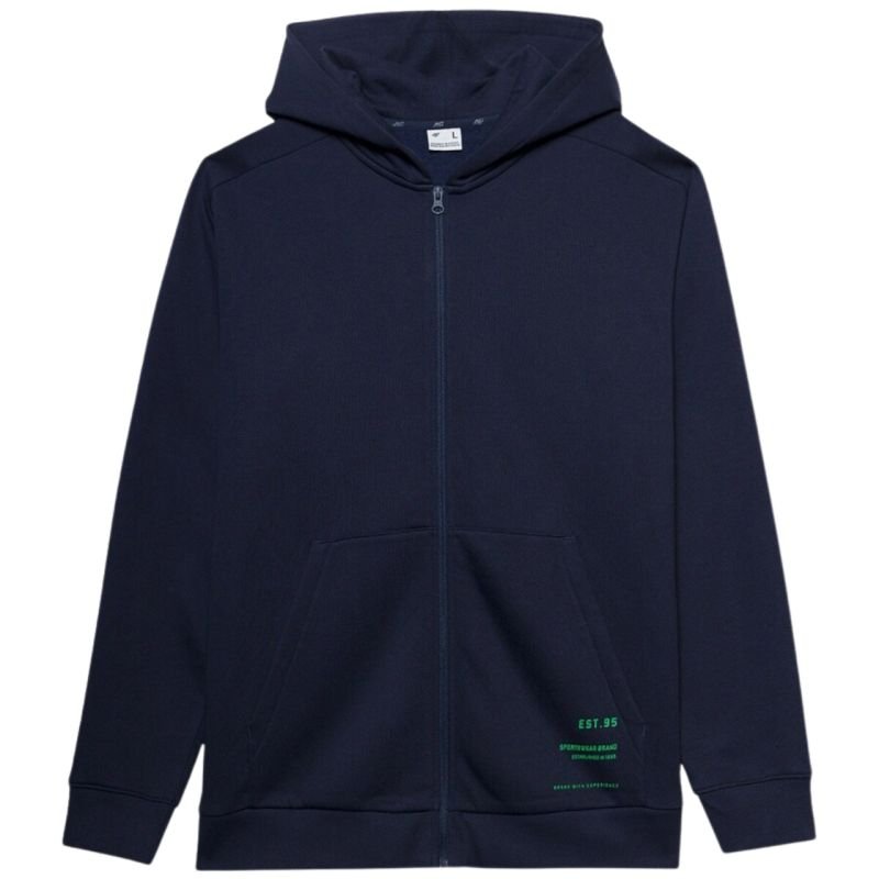 4F sweatshirt Properties: This men’s 4F sweatshirt provides comfort on the way to training, during everyday activities, and during weekend relaxation. Insulated. Zip-up design. Standard fit. Non-adjustable hood. Small print on the front and back. Open front pockets. Ribbed cuffs and hem. Brushed interior ensures thermal comfort. Made of comfortable knit fabric with a high cotton content. Main material: 80% cotton, 20% polyester Color: navy
