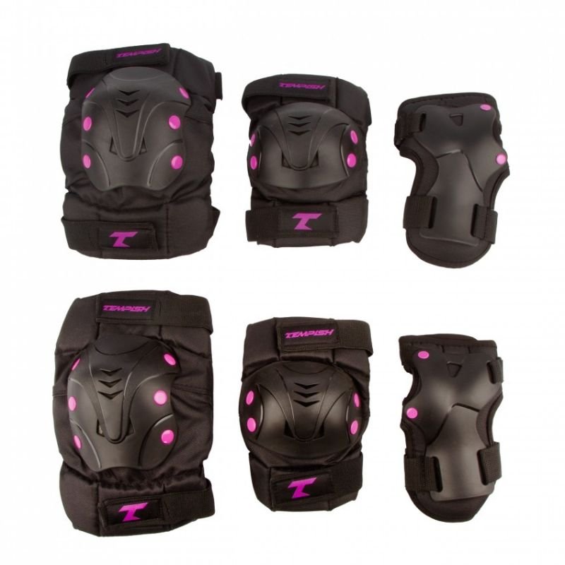 Tempish Taky 102000070 Protectors Properties: TEMPISH Taky 3-Piece Protectors Provide secure protection for the key parts of the human body where injuries most often occur (excluding the head – helmet). The set consists of wrist, knee, and elbow protectors. The wrist guard features plastic padding that protects the wrist from injury from the inside. The interior of all guards is made of soft fabric that absorbs moisture (sweat) and glides smoothly across the skin. The wrist guard is securely fastened with a thinner strap on the palm and a wider strap on the wrist featuring the TEMPISH logo. The plastic shell of the knee and elbow protectors is very strong and has a perfect anatomical shape to ensure a stable, comfortable position of the protector while riding and a high level of fall protection. The textile portion of the protector is permanently attached with three rivets. The textured portion of the protector consists of three parts: the first part is attached with an elastic band over the joint and moves with it. The second part of the protector is placed directly over the joint and protects it in the event of an impact. The third section of the protector is secured by an elastic strap under the joint and moves with the other section. This design allows for excellent movement, and the protector minimizes any restriction. After a while, the user will no longer feel the protector as it naturally adapts to their movements. The protectors are equipped with a sleeve that keeps the protector in the correct position if it becomes loose or the strap releases pressure on the skin. The protectors are a subdued black with small, colorful accents. Unisex Color: Black, Pink Size: S, M, L, XL
