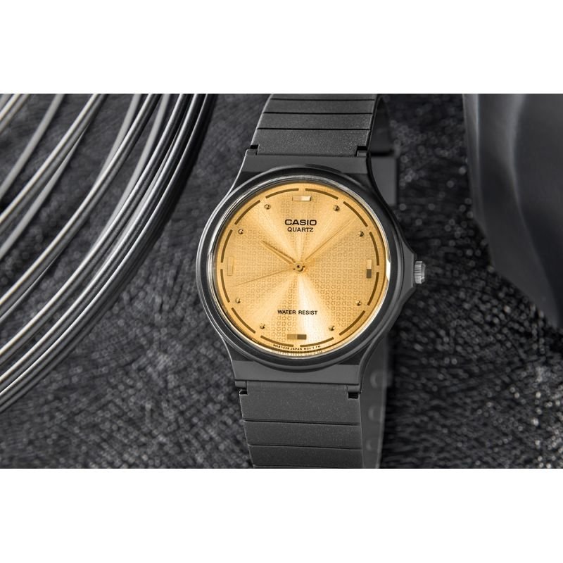 Casio MQ-76-9ALDF Women’s Watch + BOX Discover a blend of classic simplicity and modern design that makes this watch perfectly suited to both elegant and casual wear. Its slim design and compact dial ensure a perfect fit on the wrist, while the matte, supple resin strap offers unparalleled comfort – soft, flexible, and resistant to everyday wear. Gold rectangular indices and subtle dots blend harmoniously with the warm hue of the gold hands, creating a cohesive and refined aesthetic. Weighing just 20 grams! Product description: Brand : Casio Model : MQ-76-9ALDF Mechanism : Precise quartz with three hands: hour, minute and second Dial: Analog Case : Resin material Glass : Resin Glass Strap: Resin material Water resistance: WR (Water Resistant) Anti-allergic : Yes – nickel-free Dimensions in mm: Case: 38.8 mm Dial: 35 mm Thickness: 7.8 mm Strap: 19 mm wide Circumference: 140-210 mm Color: Envelope : black Dial : gold, gently reflecting light Indexes/Numbers: gold Hands: gold Second hand: gold Strap: black A CLASS OF ITS OWN The watch’s dial is the very definition of class and modern aesthetics. A delicate, geometric pattern gives it depth and subtle character, beautifully complementing the luxurious gold details. Sleek, mirror-finished hands shimmer delicately with every wrist movement, adding a refined charm. Gold rectangles and fine dot indices emphasize the elegant minimalism, making the watch a truly stylish accessory for any occasion. QUARTZ MOVEMENT – accuracy and reliability High timekeeping accuracy thanks to the use of a quartz crystal allows you to effortlessly plan your day. Furthermore, intuitive operation means you don’t have to worry about complicated winding or time setting, increasing convenience. Replacing the battery is the only regular maintenance required when using a quartz watch. It’s an ideal choice for active individuals who value comfort and simplicity. RESIN GLASS – OPTIMAL PROTECTION AND EASY TO READ DIAL Made from an exceptionally lightweight and durable resin material. Thanks to its flexibility, this material withstands shocks and falls better than traditional glass. It also provides excellent clarity and brightness, making it much easier to read the time quickly and clearly in various lighting conditions. WATER RESISTANT (WR) It offers the protection and reliability essential for everyday situations. Water resistance at the WR level offers a number of benefits for everyday use. This watch is water-resistant enough to withstand many common everyday situations, such as sudden rainfall or accidental splashes. RESIN STRIP (Resin material) A resin strap is very lightweight, ensuring comfort in everyday use, especially during physical activity. The resin material is resistant to mechanical damage, such as cracks and breaks, making it an ideal choice for watches intended for intensive use. Resin is resistant to moisture, water, and temperature changes, making these straps ideal for harsh environments. Resin straps are easy to clean – simply wipe them with a damp cloth to remove dirt. THE SET INCLUDES: Original CASIO watch CASIO branded box Warranty card with user manual CASIO WATCH – TIME AT ITS BEST The Casio brand is a legend that began in the 1970s, when the world was introduced to the first innovative electronic watches, redefining the way we think about time. Since then, Casio has continually set new standards in quality, precision, and technology, creating models that stand the test of time—both in style and durability. Every Casio watch, from the classic G-Shock to elegant, minimalist models, is a symbol of reliability you can rely on in every situation. Thanks to exceptional attention to detail and rigorous durability testing, Casio offers timepieces that have earned the title “watches for generations.” It’s a brand trusted by millions of people around the world, from globetrotters and athletes to those seeking everyday elegance. Casio isn’t just a watch—it’s durability, innovation, and history etched into every second.