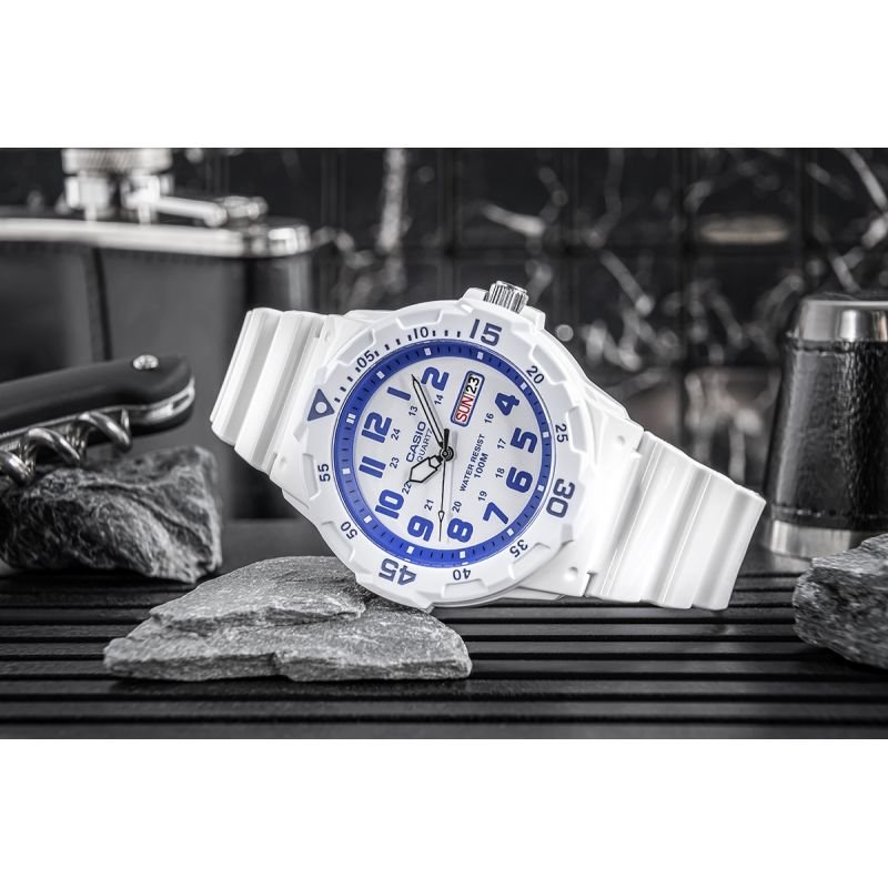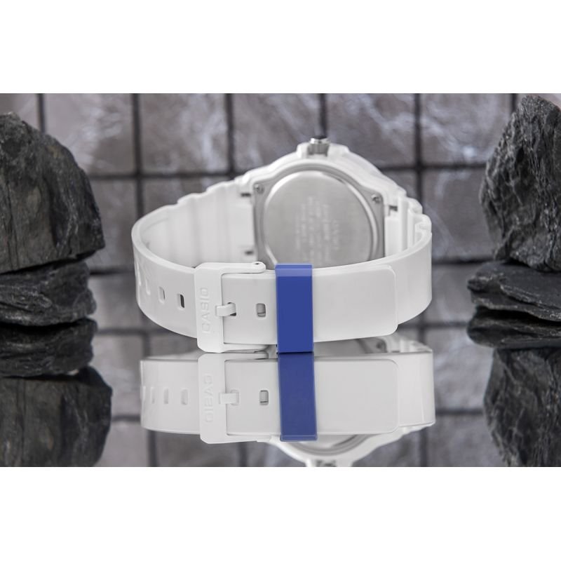 Casio MRW-200HC-7B2VDF Women’s Watch + BOX This model features a round, white case crafted from lightweight and durable resin, making the watch almost unnoticeable on the wrist. The white dial features a stylish accent – blue accents add a touch of lightness and sportiness. The dial features bold Arabic numerals that contrast with the light background, ensuring easy reading. The rotating bezel provides complete control over the time, while the day and date display is an essential addition to always keeping up with the times. It weighs just 39g! Product description: Brand : Casio Model : MRW-200HC-7B2VDF Mechanism : Precise quartz with three hands: hour, minute and second Dial: Analog with day and month date display Case : Resin material Glass : Resin Glass Strap: Resin material Backlight: Neobrite coating on hands Water resistance: 10 BAR Anti-allergic : Yes – nickel-free Dimensions in mm: Case: 43 mm Dial: 31mm Thickness: 11.5 mm Strap: 23/17 mm Circumference: 155-230 mm Color: Envelope: white Dial: white Indexes/Numbers: blue Hands: Black with Nerobite coating Second hand: black Strap: white Buckle : blue QUARTZ MOVEMENT – accuracy and reliability High timekeeping accuracy thanks to the use of a quartz crystal allows you to effortlessly plan your day. Furthermore, intuitive operation means you don’t have to worry about complicated winding or time setting, increasing convenience. Replacing the battery is the only regular maintenance required when using a quartz watch. It’s an ideal choice for active individuals who value comfort and simplicity. RESIN GLASS – OPTIMAL PROTECTION AND A CLEAR DIAL Made from an exceptionally lightweight and durable resin material. Thanks to its flexibility, this material withstands shocks and falls better than traditional glass. It also provides excellent clarity and brightness, making it much easier to read the time quickly and clearly in various lighting conditions. NEOBRITE COATING The hands are coated with Neobrite, which allows them to glow in the dark when exposed to light, making it easier to read the time in low-light conditions. Neobrite technology requires no battery power because it works by absorbing and emitting light. 10 BAR WATER RESISTANCE – RELIABILITY IN EXTREME CONDITIONS The watch easily handles accidental splashes, rain, and even contact with water during activities like swimming and recreational water sports. Its robust construction ensures durability in the urban jungle and during outdoor adventures. ADDITIONAL FUNCTIONALITY – DATE STAMP The extended date display at 3 o’clock displays both the day of the week and the day of the month, making planning easier. High-contrast markings on a white background make reading the date quick and intuitive. PRECISE FUNCTIONAL LAYOUT IN A CASIO WATCH The watch face layout and additional functions have been designed to ensure maximum readability, intuitiveness, and ease of use – both in everyday situations and during sporting events. Perfectly balanced hands ensure precise timekeeping. RESIN STRIP (Resin material) A resin strap is very lightweight, ensuring comfort in everyday use, especially during physical activity. The resin material is resistant to mechanical damage, such as cracks and breaks, making it an ideal choice for watches intended for intensive use. Resin is resistant to moisture, water, and temperature changes, making these straps ideal for harsh environments. Resin straps are easy to clean – simply wipe them with a damp cloth to remove dirt. THE SET INCLUDES: Original CASIO watch Original Casio Box Warranty card with user manual CASIO WATCH – TIME AT ITS BEST The Casio brand is a legend that began in the 1970s, when the world was introduced to the first innovative electronic watches, redefining the way we think about time. Since then, Casio has continually set new standards in quality, precision, and technology, creating models that stand the test of time—both in style and durability. Every Casio watch, from the classic G-Shock to elegant, minimalist models, is a symbol of reliability you can rely on in every situation. Thanks to exceptional attention to detail and rigorous durability testing, Casio offers timepieces that have earned the title “watches for generations.” It’s a brand trusted by millions of people around the world, from globetrotters and athletes to those seeking everyday elegance. Casio isn’t just a watch—it’s durability, innovation, and history etched into every second.
